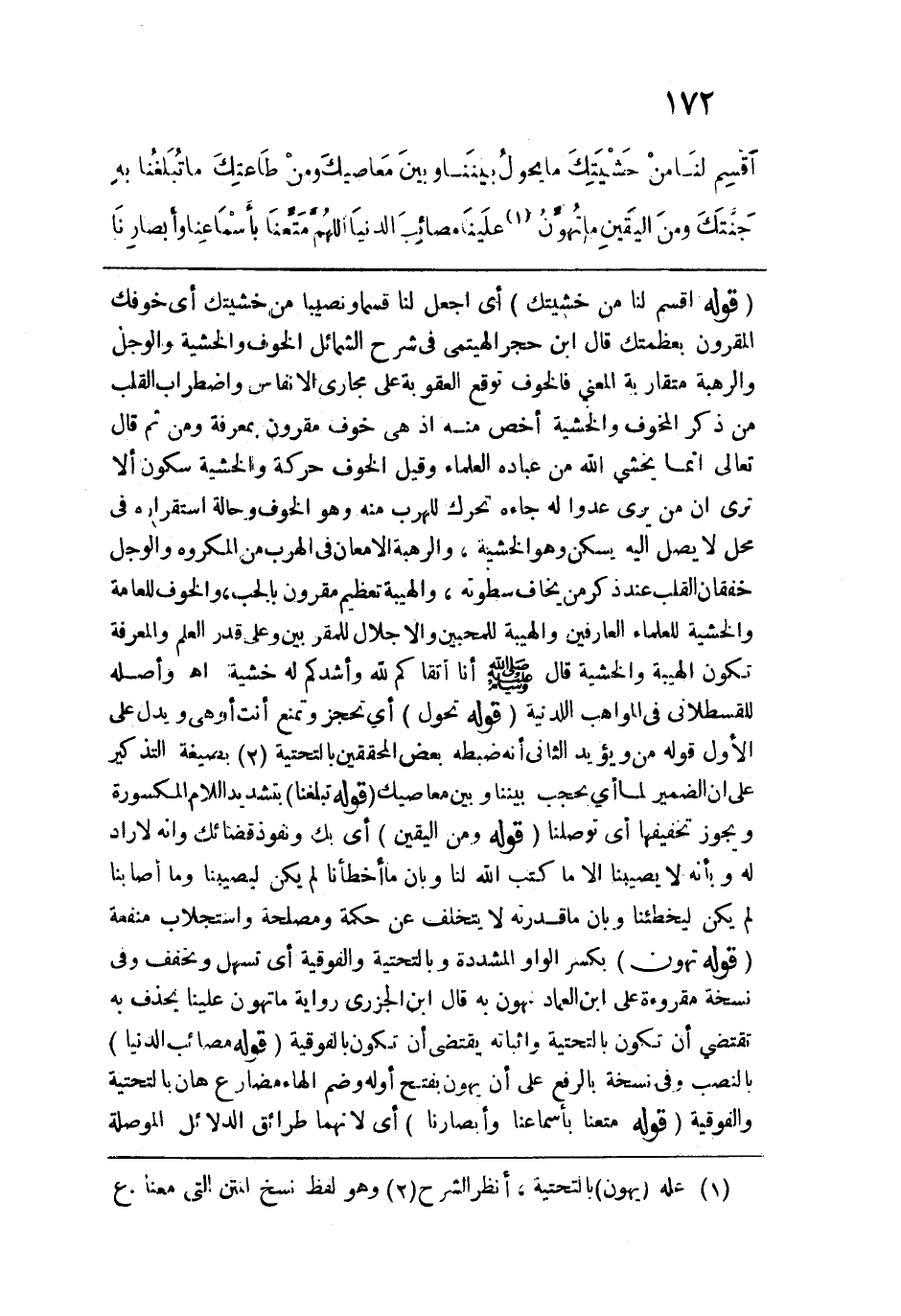 لنا قسماً ونصيباً من خشيتك أي خوفك المقرون بعظمتك قال ابن حجر الهيتمي في شرح الشمائل: الخوف والخشية والوجل والرهبة متقاربة المعنى فالخوف توقع العقوبة على مجاري الأنفاس واضطراب القلب من ذكر المخوف والخشية أخص منه إذ هي خوف مقرون بمعرفة ومن ثم قال تعالى: {إِنَّمَا يَخْشَى اللهَ مِنْ عِبَادِهِ الْعُلَمَاءُ} وقيل: الخوف حركة والخشية سكون ألا ترى إن من يرى عدواً له جاءه تحرك للهرب منه وهو الخوف وحالة استقراره في محل لا يصل إليه يسكن وهو الخشية، والرهبة إلا معان في الهرب من المكروه والوجل خفقان القلب عند ذكر من يخاف سطوته، والهيبة تعظيم مقرون بالحب، والخوف للعامة والخشية للعلماء العارفين والهيبة للمحبين والإجلال للمقربين وعلى قدر العلم والمعرفة تكون الهيبة والخشية قال -صلى الله عليه وسلم-: "أنا أتقاكم الله وأشدكم له خشية" اهـ. وأصله للقسطلاني في المواهب اللدنية. قوله: (تحول) أي تحجز وتمنع أنت أو هي ويدل على الأول قوله من ويؤيد الثاني أنه ضبطه بعض المحققين بالتحتية بصيغة التذكير على أن الضمير لما أي يحجب بيننا وبين معاصيك. قوله: (تبلغنا) بتشديد اللام المكسورة ويجوز تخفيفها أي توصلنا. قوله: (ومن اليقين) أي بك ونفوذ قضائك وإنه لا راد له وبأنه لا يصيبنا إلا ما كتب الله لنا وبأن ما أخطأنا لم يكن ليصيبنا وما أصابنا لم يكن ليخطئنا وبأن ما قدرته لا يتخلف عن حكمة ومصلحة واستجلاب منفعة. قوله (تهون) بكسر الواو المشددة وبالتحتية والفوقية أي تسهل وتخفف وفي نسخة مقروءة على ابن العماد تهون به قال ابن الجزري: رواية ما تهون علينا بحذف به تقتضي أن تكون بالتحتية وإثباته يقتضي أن تكون بالفوقية. قوله (مصائب الدنيا) بالنصب وفي نسخة بالرفع على أن يهون بفتح أوله وضم الهاء مضارع هان بالتحتية والفوقية. قوله (متعنا بأسماعنا وأبصارنا) أي لأنهما طرائق الدلائل الموصلة