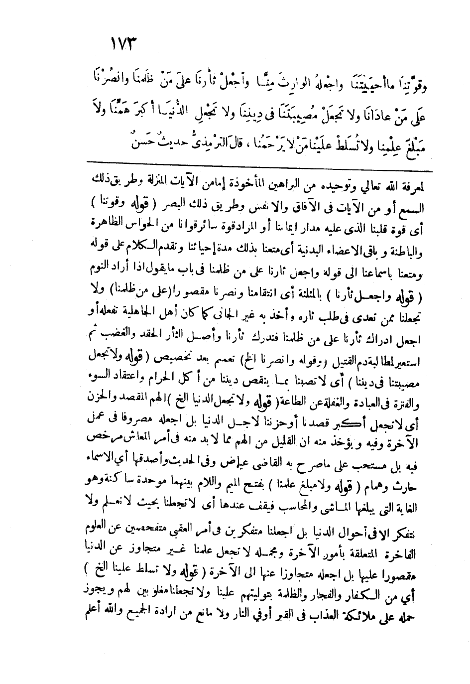 وَقُوَّتِنا مَا أحْيَيتَنَا، واجْعَلْهُ الوَارِثَ مِنا، وَاجْعَلْ ثأرَنا على مَنْ ظَلَمَنا، وَانْصُرْنا على مَنْ عَادَانا، وَلاَ تَجْعَلْ مُصِيبَتَنَا في دِينِنَا، وَلاَ تَجْعَلِ الدُّنْيا أكبَرَ هَمِّنا وَلا مَبْلَغَ عِلْمِنا، وَلا تُسَلِّط عَلَينا مَنْ لا يَرْحَمُنا" قال الترمذي: حديث حسن.