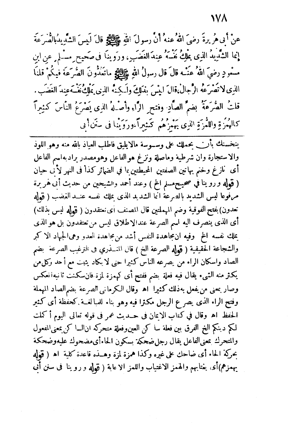 لأبي حيان. قوله: (وروينا في صحيح مسلم الخ) وعند أحمد والشيخين من حديث أبي هريرة مرفوعاً ليس الشديد بالصرعة إنما الشديد الذي يملك نفسه عند الغضب. قوله: (تعدون) بفتح الفوقية وضم المهملتين قال المصنف: أي تعتقدون. قوله: (ليس بذلك) أي الذي ينصرف إليه اسم الصرعة عند الاطلاق ليس من تعتقدون بل هو الذي يملك نفسه الخ وفيه إن مجاهدة النفس أشد من مجاهدة العدو وهي الجهاد الأكبر والشجاعة الحقيقية. قوله: (الصرعة الخ) قال المنذري في الترغيب الصرعة بضم الصاد وإسكان الراء من يصرعه النّاس كثيراً حتى لا يكاد يثبت مع أحد وكل من يكثر منه الشيء يقال فيه: فعلة بضم الفتح أي كهمزة لمزة فإن سكنت ثانيه انعكس وصار بمعنى من يفعل به ذلك كثيراً اهـ، وقال الكرماني: الصرعة بضم إلصاد المهملة وفتح الراء الذي يصرع الرجل مكثراً فيه وهو بناء للمبالغة كحفظة أي كثير الحفظ اهـ، وقال في كتاب الإيمان في حديث عمر في قوله تعالى: {الْيَوْمَ أَكْمَلْتُ لَكُمْ دِينَكُمْ} الخ، الفرق بين فعلة ساكن العين وفي علة متحركه إن الساكن بمعنى المفعول والمتحرك بمعنى الفاعل يقال: رجل ضحكه بسكون الحاء أي مضحوك عليه وضحكة بحركة الحاء أي ضاحك على غيره وكذا همزة لمزة وهذه قاعدة كلية اهـ. قوله: (يهمزهم) أي يغتابهم والهمز الاغتياب واللمز الإعابة.