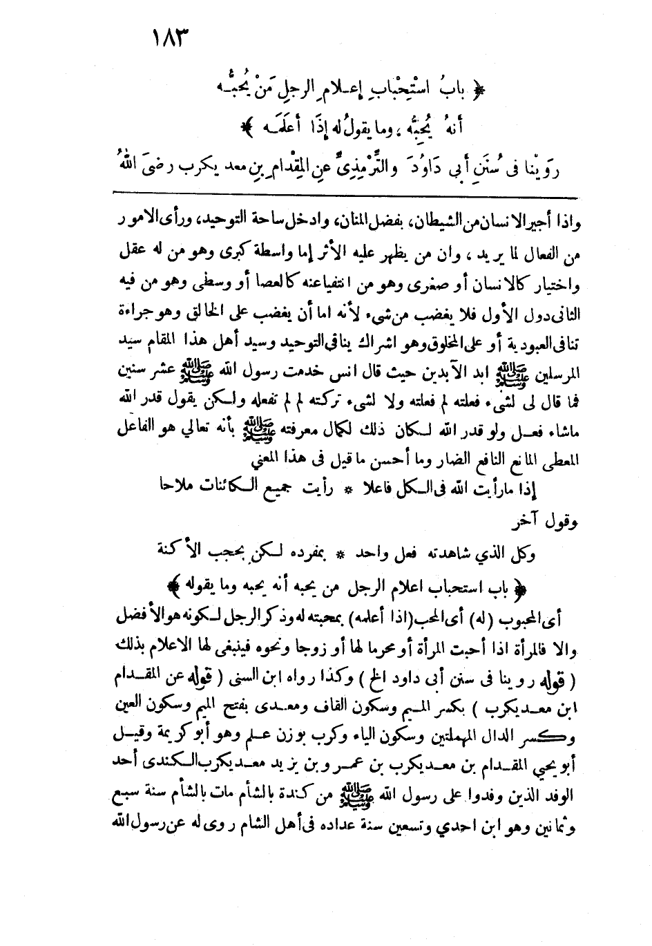 أي المحبوب (له) أي المحب (إذا أعلمه) بمحبته له وذكر الرجل لكونه هو الأفضل وإلا فالمرأة إذا أحبت المرأة أو محرماً لها أو زوجاً ونحوه فينبغي لها الإعلام بذلك. قوله: (روينا في سنن أبي داود الخ) وكذا رواه ابن السني. قوله: (عن المقدام بن معد يكرب) بكسر الميم وسكون القاف ومعدي بفتح الميم وسكون العين وكسر الدال المهملتين وسكون الياء وكرب بوزن علم وهو أبو كريمة وقيل: أبو يحيى المقدام بن معد يكرب بن عمرو بن يزيد معد يكرب الكندي أحد الوفد الذين وفدوا على رسول الله -صلى الله عليه وسلم- من كندة بالشأم مات بالشأم سنة سبع وثمانين وهو ابن جدي وتسعين سنة عداده في أهل الشام روى له عن رسول الله