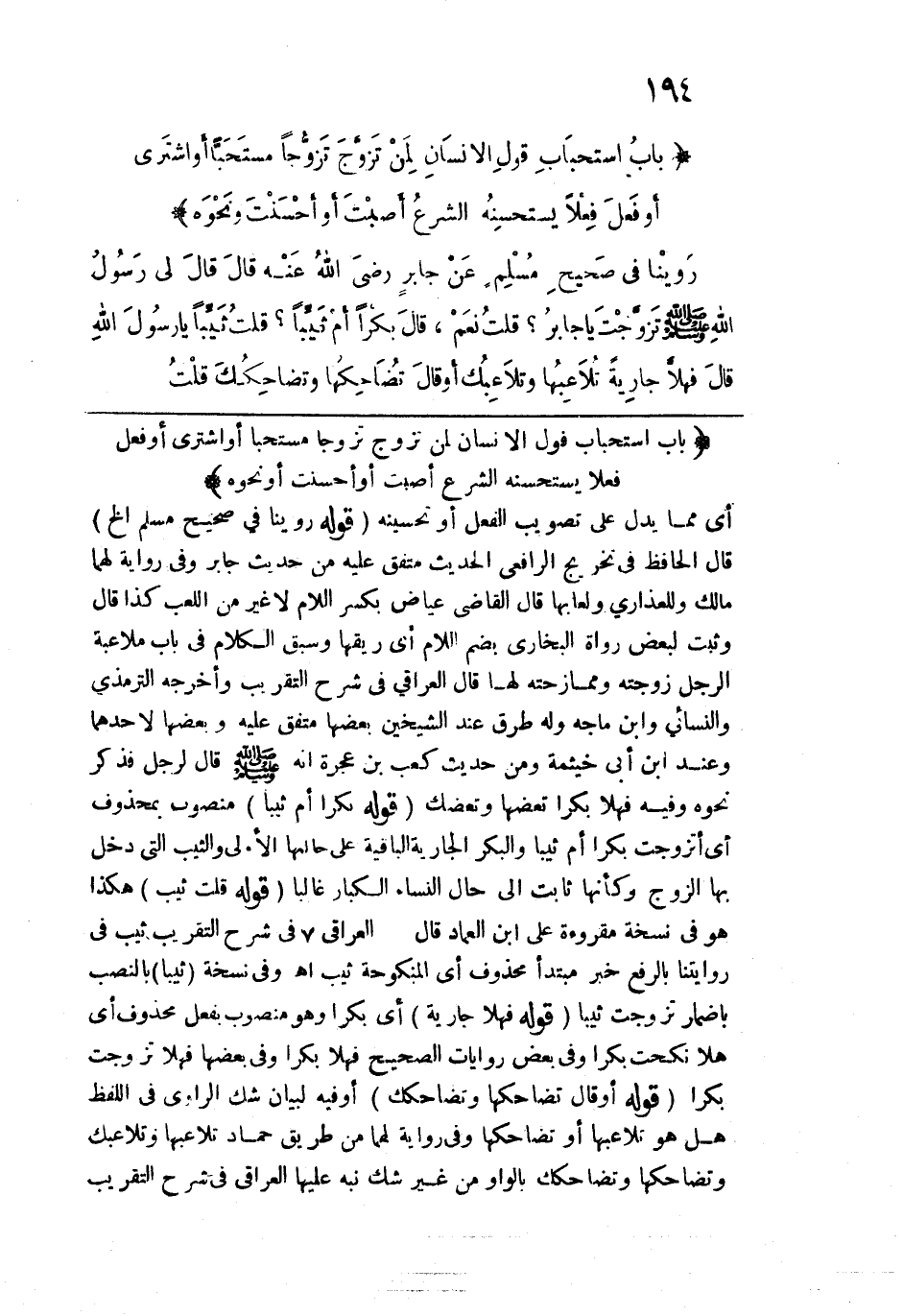 في تخريج الرافعي الحديث متفق عليه من حديث جابر وفي رواية لهما مالك وللعذارى ولعابها قال القاضي عياض بكسر اللام لا غير من اللعب كذا قال وثبت لبعض رواة البخاري بضم اللام أي ريقها وسبق الكلام في باب ملاعبة الرجل زوجته وممازحته لها قال العراقي في شرح التقريب وأخرجه الترمذي والنسائي وابن ماجه وله طرق عند الشيخين بعضها متفق عليه وبعضها لأحدهما وعند ابن أبي خيثمة ومن حديث كعب بن عجرة أنه -صلى الله عليه وسلم- قال لرجل فذكر نحوه وفيه فهلاَّ بكراً تعضها وتعضك. قوله: (بكراً أم ثيباً) منصوب بمحذوف أي أتزوجت بكراً أم ثيباً والبكر الجارية الباقية على حالها الأولى والثيب التي دخل بها الزوج وكأنها ثابت إلى حال النساء الكبار غالباً. قوله: (قلت ثيب) هكذا هو في نسخة مقروءة على ابن العماد قال العراقي في شرح التقريب ثيب في روايتنا بالرفع خبر مبتدأ محذوف أي المنكوحة ثيب اهـ، وفي نسخة (ثيباً) بالنصب بإضمار تزوجت ثيباً. قوله: (فهلاَّ جارية) أي بكراً وهو منصوب بفعل محذوف أي هلاَّ نكحت بكراً وفي بعض روايات الصحيح فهلاَّ بكراً وفي بعضها فهلاَّ تزوجت بكراً. قوله: (أو قال تضاحكها وتضاحكك) أو فيه لبيان شك الراوي في اللفظ هل هو تلاعبها أو تضاحكها وفي رواية لهما من طريق حماد تلاعبها وتلاعبك وتضاحكها وتضاحك بالواو من غير شك نبه عليها العراقي في شرح التقريب.