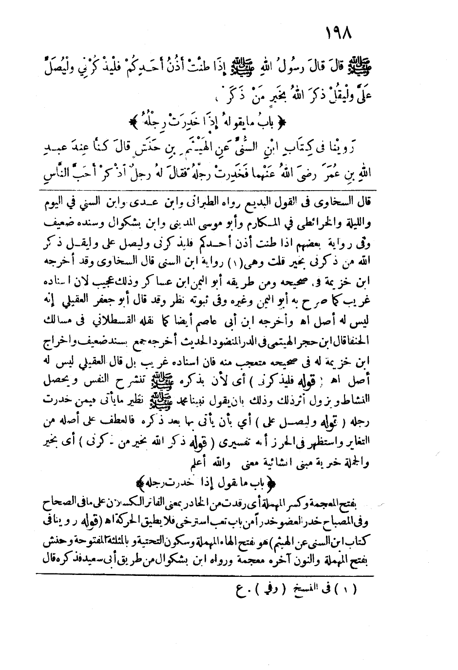 قال السخاوي في القول البديع رواه الطبراني وابن عدي وابن السني في اليوم والليلة والخرائطي في المكارم وأبو موسى المديني وابن بشكوال وسنده ضعيف وفي رواية بعضهم إذا طنت أذن أحدكم فليذكرني وليصل عليّ وليقل ذكر الله من ذكرني بخير قلت وهي رواية ابن السني قال السخاوي وقد أخرجه ابن خزيمة في صحيحه ومن طريقه أبو اليمن بن عساكر وذلك عجيب لأن إسناده غريب كما صرح به أبو اليمن وغيره وفي ثبوته نظر وقد قال أبو جعفر العقيلي إنه ليس له أصل اهـ، وأخرجه ابن أبي عاصم أيضاً كما نقله القسطلاني في مسالك الحنفا قال ابن حجر الهيتمي في الدر المنضود الحديث أخرجه جمع بسند ضعيف وإخراج ابن خزيمة له في صحيحه متعجب منه فإن إسناده غريب بل قال العقيلي: ليس له أصل اهـ. قوله (فليذكرني) أي لأن بذكره -صلى الله عليه وسلم- تنشرح النفس ويحصل النشاط ويزول أثر ذلك وذلك بأن يقول نبينا محمد -صلى الله عليه وسلم- نظير