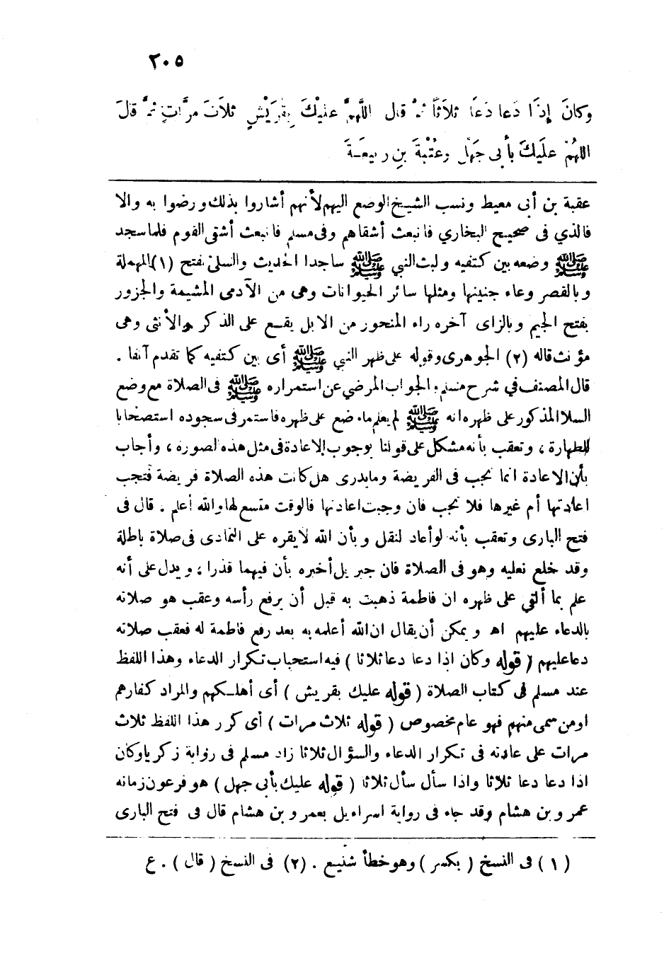 عقبة بن أبي معيط ونسب الشيخ الوضع إليهم لأنهم أشاروا بذلك ورضوا به وإلا فالذي في صحيح البخاري فانبعث أشقاهم وفي مسلم فانبعث أشقى القوم فلما سجد -صلى الله عليه وسلم- وضعه بين كتفيه ولبث النبي -صلى الله عليه وسلم- ساجداً الحديث والسلى بفتح المهملة وبالقصر وعاء جنينها ومثلها سائر الحيوانات وهي من الآدمي المشيمة والجزور بفتح الجيم وبالزاي آخره راء المنحور من الإبل يقع على الذكر والأنثى وهي مؤنث قاله الجوهري وقوله على ظهر النبي -صلى الله عليه وسلم- أي بين كتفيه كما تقدم آنفاً. قال المصنف في شرح مسلم والجواب المرضي عن استمراره -صلى الله عليه وسلم- في الصلاة مع وضع السلا المذكور على ظهره إنه -صلى الله عليه وسلم- لم يعلم ما وضع على ظهره فاستمر في سجوده استصحاباً للطهارة، وتعقب بأنه مشكل على قولنا بوجوب الإعادة في مثل هذه الصورة، وأجاب بأن الإعادة إنما تجب في الفريضة وما يدري هل كانت هذه الصلاة فريضة فتجب إعادتها أم غيرها فلا تجب فإن وجبت إعادتها فالوقت متسع لها والله أعلم. قال في فتح الباري وتعقب بأنه لو أعاد لنقل وبأن الله لا يقره على التمادي في صلاة باطلة وقد خلع نعليه وهو في الصلاة فإن جبريل أخبره بأن فيهما قذراً، ويدل على أنه علم بما ألقى على ظهره إن فاطمة ذهبت به قبل أن يرفع رأسه وعقب هو صلاته بالدعاء عليهم اهـ، ويمكن أن يقال إن الله أعلمه به بعد رفع فاطمة له فعقب صلاته دعا عليهم. قوله: (وكان إذا دعا دعا ثلاثاً) فيه استحباب تكرار الدعاء وهذا اللفظ عند مسلم في كتاب الصلاة. قوله: (عليك بقريش) أي أهلكهم والمراد كفارهم أو من سمي منهم فهو عام مخصوص. قوله: (ثلاث مرات) أي كرر هذا اللفظ ثلاث مرات على عادته في تكرار الدعاء والسؤال ثلاثاً زاد مسلم في رواية زكريا وكان إذا دعا دعا ثلاثاً وإذا سأل سأل ثلاثاً. قوله: (عليك بأبي جهل) هو فرعون زمانه عمرو بن هشام وقد جاء في رواية إسرائيل بعمرو بن هشام قال في فتح الباري