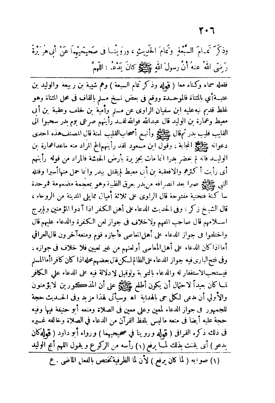 فلعله سماه وكناه معاً. قوله: (وذكر تمام السبعة) وهم شيبة بن ربيعة والوليد بن عتبة أي بالمثناة فالموحدة ووقع في بعض نسخ مسلم بالقاف في محل المثناة وهو غلط قديم نبه عليه ابن سفيان الراوي عن مسلم وأمية بن خلف وعقبة بن أبي معيط وعمارة بن الوليد قال عبد الله: فوالله لقد رأيتهم صرعى يوم بدر سحبوا إلى القليب قليب بدر ثم قال -صلى الله عليه وسلم- وأتبع أصحاب القليب لعنة قال المصنف: هذه إحدى دعواته - صلى الله عليه وسلم - المجابة، وقول ابن مسعود: لقد رأيتهم الخ، المراد منه ما عدا عمارة بن الوليد فإنه لم يحضر بدراً إنما مات بجزيرة بأرض الحبشة فالمراد من قوله: رأيتهم أي رأيت أكثرهم وإلا فعقبة بن أبي معيط لم يقتل ببدر وإنما حمل منها أسيراً وقتله النبي -صلى الله عليه وسلم- صبراً بعد انصرافه من بدر بعرق الظبية وهو بمعجمة مضمومة فموحدة ساكنة فتحتية مفتوحة قال الراوي على ثلاثة أميال مما يلي المدينة من الروحاء، قال الشيخ زكريا وفي الحديث الدعاء على أهل الكفر إذا آذوا المؤمنين ولم يرج إسلامهم قال صاحب المفهم: ولا خلاف في جواز لعن الكفرة والدعاء عليهم