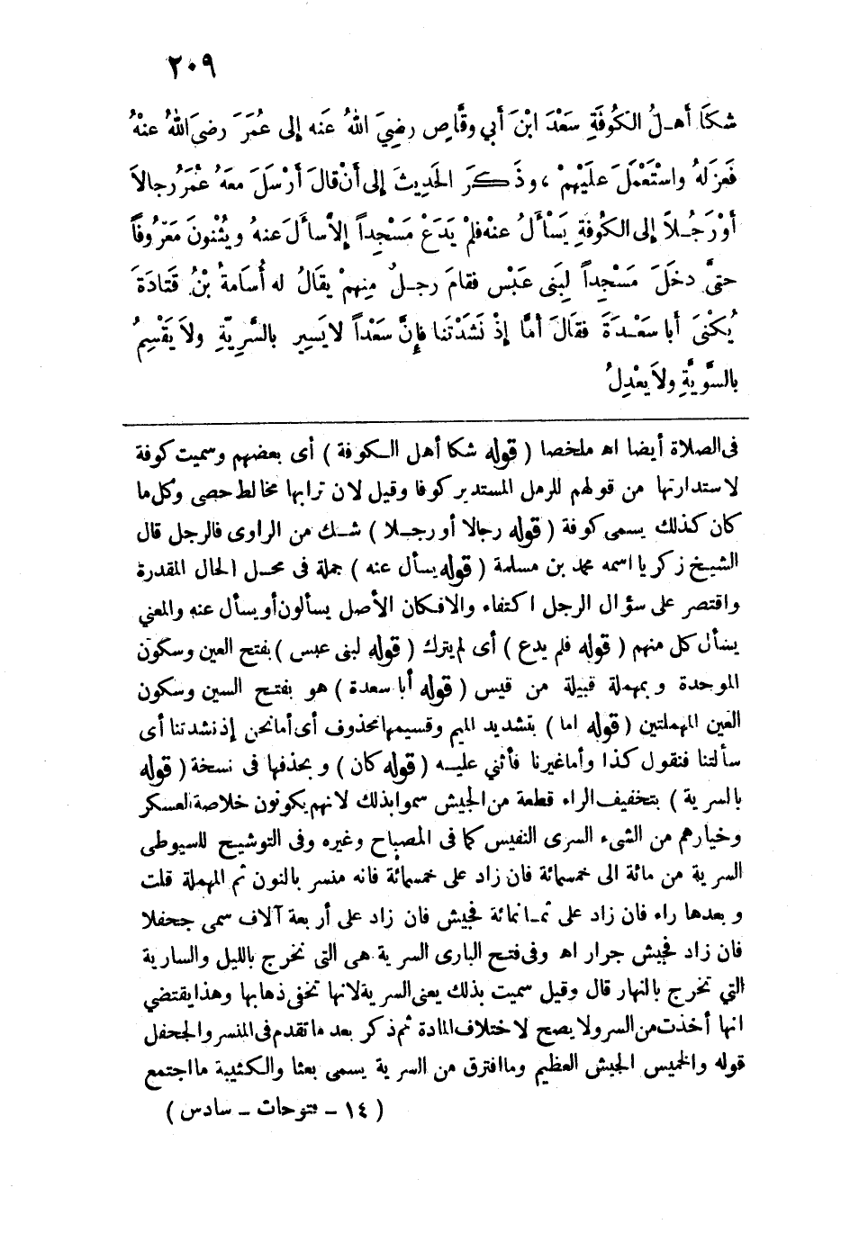 "شكا أهل الكوفة سعد بن أبي وقاص رضي الله عنه إلى عمر رضي الله عنه، فعزله واستعمل عليهم ... " وذكر الحديث ... إلى أن قال: "أرسل معه عمر رجالاً أو رجلاً إلى الكوفة: يسأل عنه، فلم يَدَعْ مسجداً إلا سأل عنه ويثنون معروفاً، حتى دخل مسجداً لبني عَبْس، فقام رجل منهم يقال له: أسامة بن قتادة، يكنى أبا سعدة، فقال: أما إذا نشدتنا فإن سعداً لا يسير بالسرِّية، ولا يقسم بالسوية، ولا يعدل