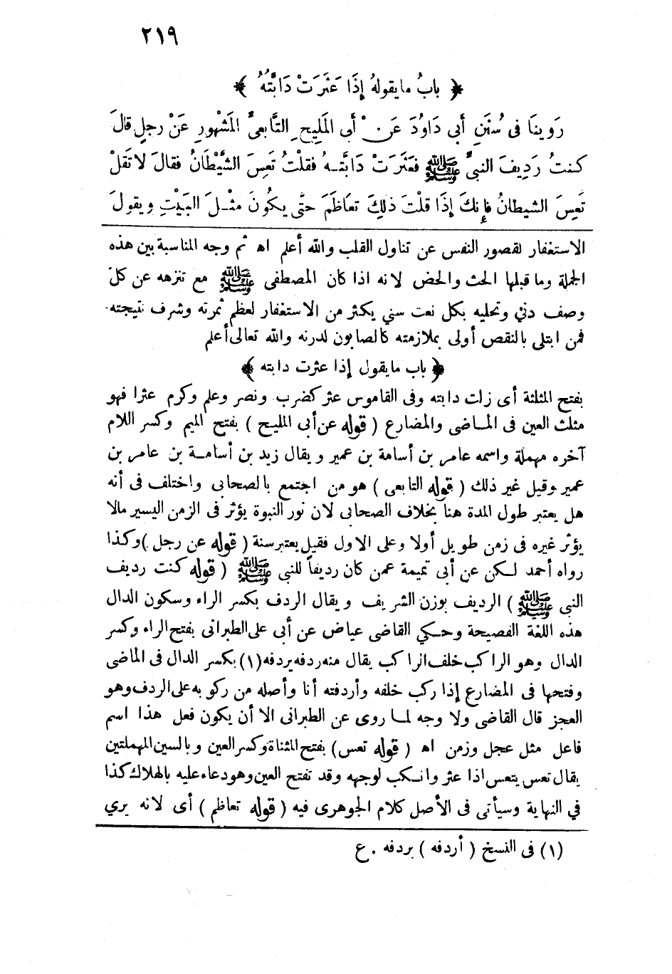 بفتح المثلثة أي زلت دابته وفي القاموس عثر كضرب ونصر وعلم وكرم عثراً فهو مثلث العين في الماضي والمضارع. قوله: (عن أبي المليح) بفتح الميم وكسر اللام آخره مهملة واسمه عامر بن أسامة بن عمير ويقال: زيد بن أسامة بن عامر بن عمير وقيل غير ذلك. قوله: (التابعي) هو من اجتمع بالصحابي واختلف في أنه هل يعتبر طول المدة هنا بخلاف الصحابي لأن نور النبوة يؤثر في الزمن اليسير ما لا يؤثر غيره في زمن طويل أولاً وعلى الأول فقيل يعتبر سنة. قوله: (عن رجل) وكذا رواه أحمد لكن عن أبي تميمة عمن كان رديفاً للنبي -صلى الله عليه وسلم-. قوله: (كنت رديف النبي -صلى الله عليه وسلم-) الرديف بوزن الشريف ويقال: الردف بكسر الراء وسكون الدال هذه اللغة الفصيحة وحكى القاضي عياض عن أبي علي الطبراني بفتح الراء وكسر الدال وهو الراكب خلف الراكب يقال منه ردفة يردفه بكسر الدال في الماضي وفتحها في المضارع إذا ركب خلفه وأردفته أنا وأصله من ركوبه على الردف وهو العجز قال القاضي: ولا وجه لما روى عن الطبراني إلا أن يكون فعل هذا اسم فاعل مثل عجل وزمن اهـ. قوله: (تعس) بفتح المثناة وكسر العين وبالسين المهملتين يقال: تعس يتعس إذا عثر وانكب لوجهه وقد تفتح العين وهو دعاء عليه بالهلاك كذا في النهاية وسيأتي في الأصل كلام الجوهري فيه. قوله: (تعاظم) أي لأنه يرى