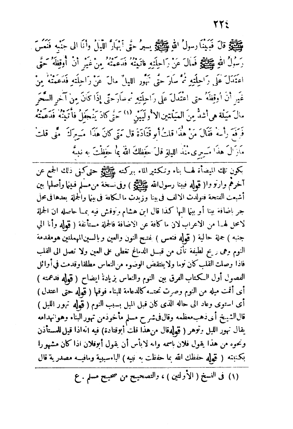 يكون تلك الميضأة لها بناء وتكثير الماء ببركته -صلى الله عليه وسلم- حتى كفى ذلك الجمع عن آخرهم وارتووا. قوله: (فبينا رسول الله -صلى الله عليه وسلم-) وفي نسخة من مسلم فبينما وأصلها بين أشبعت الفتحة فتولدت الألف في بينا وزيدت ما لكافة في بينما والجملة بعدها في محل جر بإضافة بينا أو بينما إليها كذا قال ابن هشام ونوقش فيه بما حاصله إن الجملة لا محل لها من الإعراب لأن ما كافة عن الإضافة فالجملة مستأنفة. قوله: (وأنا إلى جنبه) جملة حالية. قوله: (فنعس) بفتح النون والعين وبالسين المهملتين هو مقدمة النوم وهي ريح لطيفة تأتي من قبل الدماغ تغطي على العين ولا تصل إلى القلب فإذا وصلت القلب كان نوماً ولا ينتقض الوضوء من النعاس مطلقاً وقدمت في أوائل الفصول أول الكتاب الفرق بين النوم والنعاس بزيادة إيضاح. قوله: (فدعمته) أي أقمت ميله من النوم وصرت تحته كالدعامة للبناء فوقها. قوله: (حتى اعتدل) أي استوى وعاد إلى حاله الذي كان قبل الميل بسبب النوم. قوله: (تهور الليل) قال الشيخ: أي ذهب معظمه وقال في شرح مسلم مأخوذون تهور الباء وهو انهدامه يقال: تهور الليل وتوهر. قوله: (قال: من هذا؟ قلت: أبو قتادة) فيه إنه إذا قيل للمستأذن ونحوه من هذا يقول: فلان باسمه وإنه لا بأس أن يقول أبو فلان إذا كان مشهوراً بكنيته. قوله: (حفظك الله بما حفظت به نبيه) الباء سببية وما فيه مصدرية قال