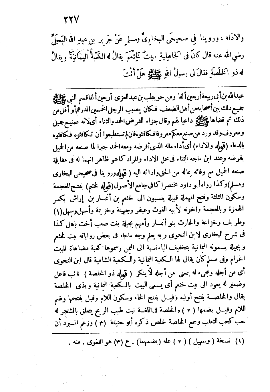 قوله: (وروينا في صحيحي البخاري ومسلم) وكذا رواه أبو داود مختصراً كما في جامع الأصول. قوله: (لخثعم) بفتح المعجمة وسكون المثلثة وفتح المهملة قبيلة ينسبون إلى خثعم بن أنمار بن إراش بكسر الهمزة وبالمعجمة وإخوته لأبيه الغوث وعبقر وجهينة وخزيمة وأسهل وسهل وطريف وخزاعة والحارث بنو أنمار وأمهم بجيلة بنت صعب أخت باهل كذا في شرح البخاري لابن النحوي وبه يعلم وجه ما جاء في بعض رواياته بيت لخثعم وبجيلة يسمونه اليمانية بتخفيف الياء نسبة إلى اليمن وسموها كعبة مضاهاة للبيت الحرام وفي مسلم كان يقال لها: الكعبة اليمانية والكعبة الشامية قال ابن النحوي أي من أجله ومجيء له بمعنى من أجله لا ينكر. قوله: (ذو الخلصة) نائب فاعل وضمير له يعود إلى بيت خثعم أي يسمى البيت بالكعبة اليمانية وبذي الخلصة يقال: والخلصة بفتح أوليه وقيل بفتح الخاء وسكون اللام وقيل بفتحها وضم اللام وقيل بضمها والخلصة في اللغة نبت طيب الريح يتعلق بالشجر له حب كحب الثعلب وجمع الخلصة خلص ذكره أبو حنيفة وزعم المبرد أن