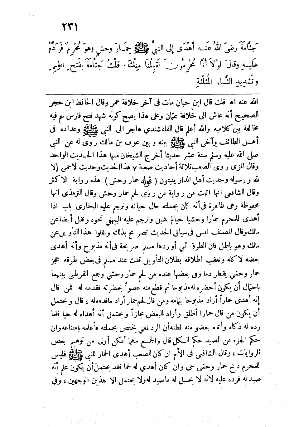 وحديث لا حمى إلا لله ورسوله وحديث أهل الدار يبيتون. قوله: (حمار وحش) هذه رواية الأكثر وقال الشافعي: إنها أثبت من رواية من روى لحم حمار وحش وقال الترمذي إنها محفوظة وهي ظاهرة في أنه كان بجملته حال حياته وترجم عليه البخاري باب إذا أهدى للمحرم حماراً وحشياً حياً لم يقبل وترجم عليه البيهقي نحوه ونقل أيضاً عن مالك وقال المصنف: ليس في سياق الحديث تصريح بذلك ونقلوا هذا التأويل عن مالك وهو باطل فإن الطرق التي أوردها مسلم صريحة في أنه مذبوح وأنه أهدى بعضه لأكله وتعقب إطلاقه بطلان التأويل قلت عند مسلم في بعض طرقه عجز حمار وحشي يقطر دماً وفي بعضها عنده من لحم حمار وحشي وجمع القرطبي بينهما باحتمال أن يكون أحضره له مذبوحاً ثم قطع منه عضواً بحضرته فقدمه له فمن قال: إنه أهدى حماراً أراد مذبوحاً بتمامه ومن قال: لحم حمار أراد ما قدمه له، قال: ويحتمل أن يكون من قال حماراً أطلق وأراد البعض مجازاً ويحتمل أنه أهداه له حياً فلما رده له ذكاه وأتاه بعضو منه لظنه أن الرد لمعنى يختص بجملته فأعلمه بامتناعه وإن حكم الجزء من الصيد حكم الكل قال: والجمع مهما أمكن أولى من توهيم بعض الروايات، وقال الشافعي في الأم إن كان الصعب أهدى الحمار للنبي -صلى الله عليه وسلم- فليس للمحرم ذبح حمار وحشي حي وإن كان أهدي له لحماً فقد يحتمل أن يكون علم أنه صيد له فرده عليه لأنه لا يحل له ما صيد له ولا يحتمل إلا هذين الوجهين، وفي