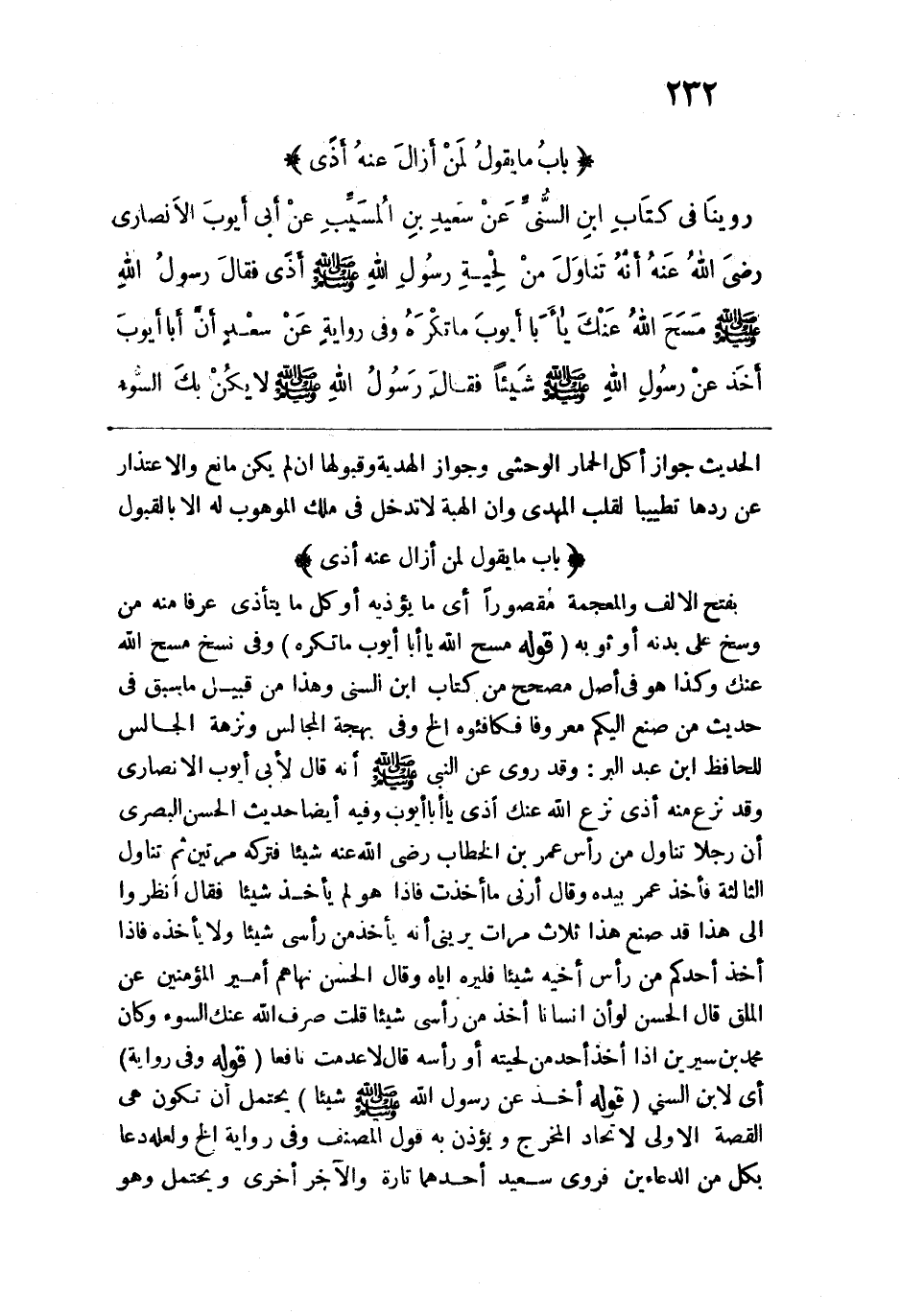 روينا في كتاب ابن السني عن سعيد بن المسيب عن أبي أيوب الأنصاري رضي الله عنه، أنه تناول من لحية رسول الله -صلى الله عليه وسلم- أذىً، فقال رسولُ الله - صلى الله عليه وسلم -: "مَسَحَ اللهُ عَنْكَ يا أبا أيُّوب ما تَكْرَهُ".
