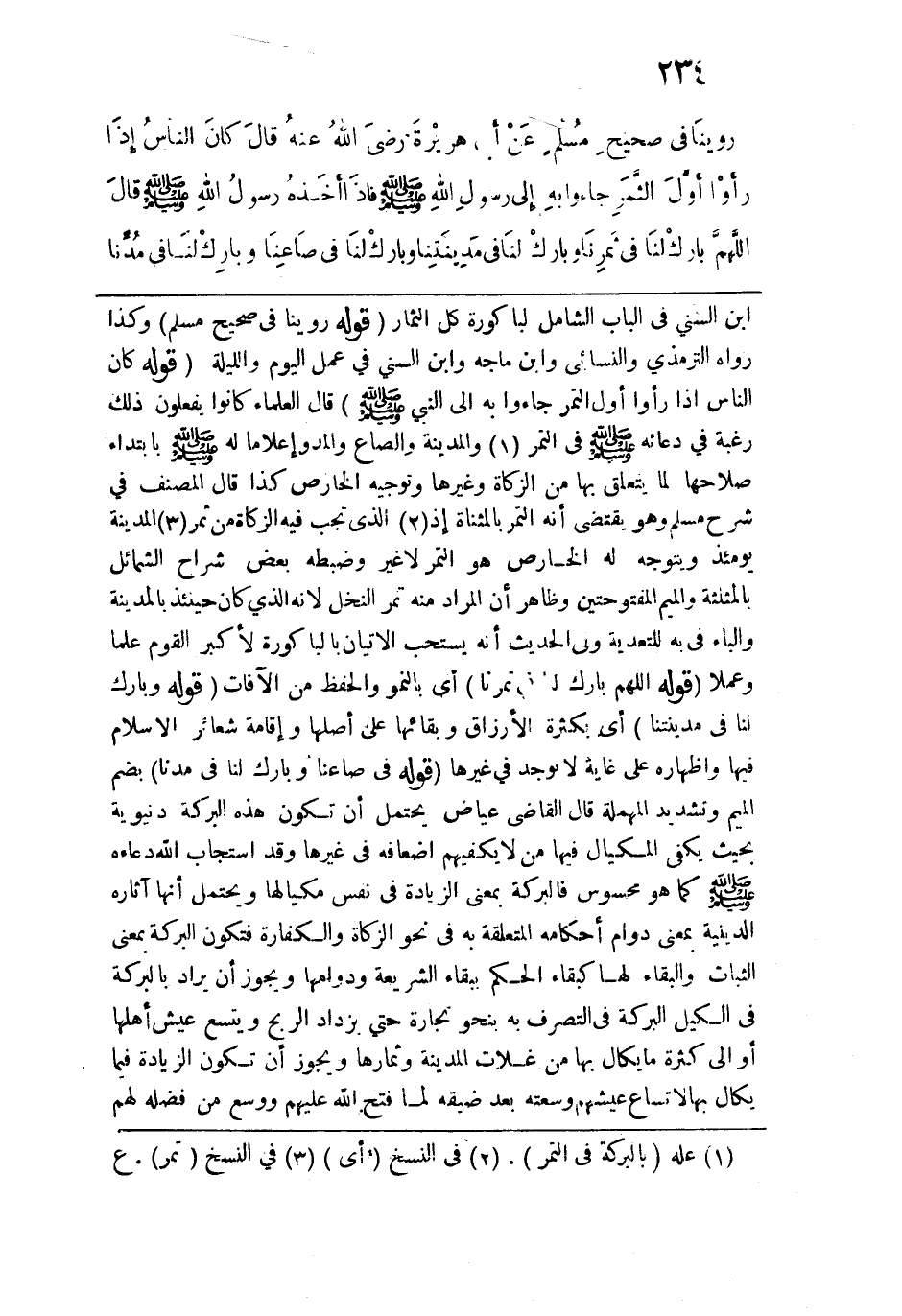 قوله: (روينا في صحيح مسلم) وكذا رواه الترمذي والنسائي وابن ماجه وابن السني في عمل اليوم والليلة. قوله: (كان النّاس إذا رأوا أول التمر جاءوا به إلى النبي -صلى الله عليه وسلم-) قال العلماء كانوا يفعلون ذلك رغبة في دعائه في التمر والمدينة والصاع والمد وإعلاماً له -صلى الله عليه وسلم- بابتداء صلاحها لما يتعلق بها من