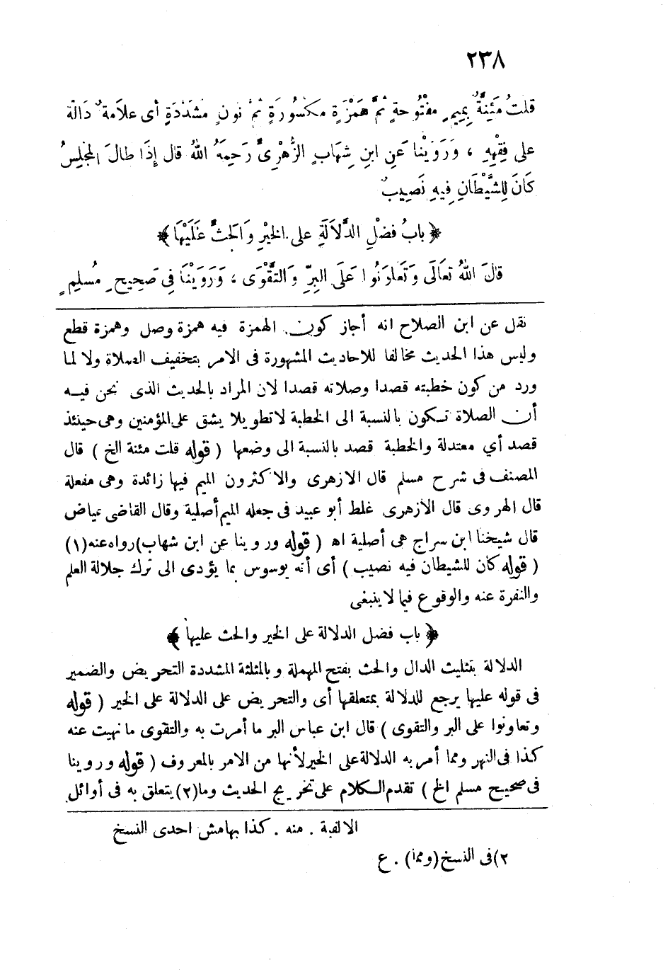 فقل عن ابن الصلاح إنه جاز كون الهمزة فيه همزة وصل وهمزة قطع وليس هذا الحديث مخالفاً للأحاديث المشهورة في الأمر بتخفيف الصلاة ولا لما ورد من كون خطبته قصدًا وصلاته قصداً لأن المراد بالحديث الذي نحن فيه أن الصلاة تكون بالنسبة إلى الخطبة لا تطويلاً يشق على المؤمنين وهي حينئذٍ قصد أي معتدلة والخطبة قصد بالنسبة إلى وضعها. قوله: (قلت مئنة الخ) قال المصنف في شرح مسلم قال الأزهري والأكثرون الميم فيها زائدة وهي مفعلة قال الهروى قال الأزهري: غلط أبو عبيد في جعله الميم أصلية وقال القاضي عياض: قال شيخنا ابن سراج: هي أصلية اهـ. قوله: (وروينا عن ابن شهاب) رواه عنه. قوله: (كان للشيطان فيه نصيب) أي أنه يوسوس بما يؤدي إلى ترك جلالة العلم والنفرة عند والوقوع فيما لا ينبغي.
