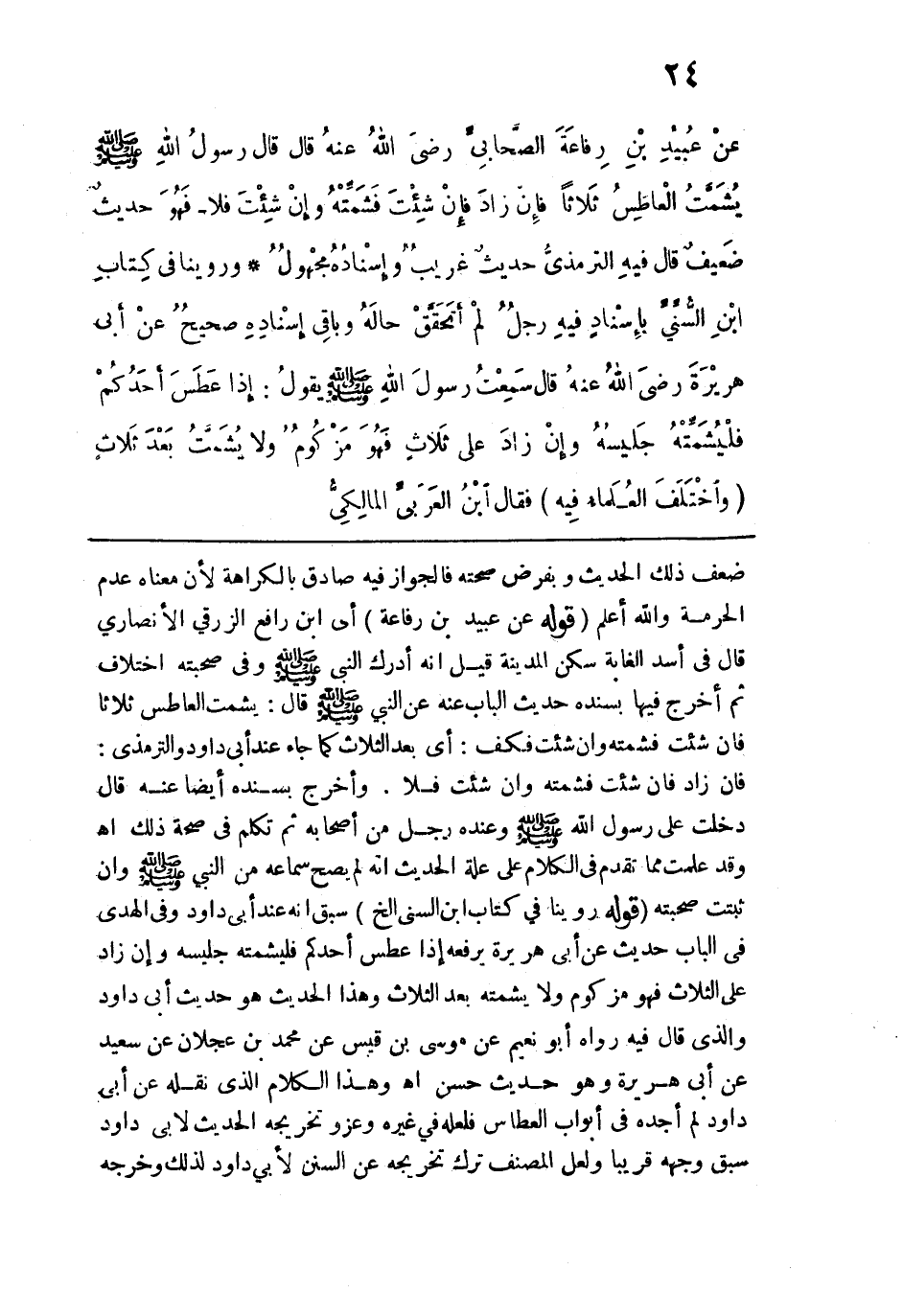 ضعف ذلك الحديث وبفرض صحته فالجواز فيه صادق بالكراهة لأن معناه عدم الحرمة والله أعلم. قوله: (عن عبيد بن رفاعة) أي ابن رافع الزرقي الأنصاري قال في أسد الغابة سكن المدينة قيل إنه أدرك النبي -صلى الله عليه وسلم- وفي صحبته اختلاف ثم أخرج فيها بسنده حديث الباب عنه عن النبي -صلى الله عليه وسلم- قال: يشمت العاطس ثلاثاً فإن شئت فشمته وإن