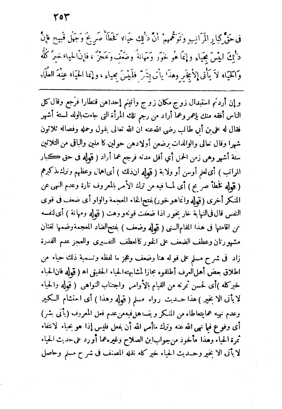 {وَإِنْ أَرَدْتُمُ اسْتِبْدَالَ زَوْجٍ مَكَانَ زَوْجٍ وَآتَيْتُمْ إِحْدَاهُنَّ قِنْطَارًا} [النساء: 20] فرجع وقال: كل النّاس أفقه منك يا عمر وعما أراد من رجم تلك المرأة التي جاءت بالولد لستة أشهر فقال له علي بن أبي طالب رضي الله عنه: إن الله تعالى يقول: {وَحَمْلُهُ وَفِصَالُهُ ثَلَاثُونَ شَهْرًا} وقال تعالى: {وَالْوَالِدَاتُ يُرْضِعْنَ أَوْلَادَهُنَّ حَوْلَيْنِ كَامِلَيْنِ} والباقي من الثلاثين ستة أشهر وهي زمن الحمل أي أقل مدته فرجع عما أراد. قوله: (في حق كبار المراتب) أي لعلم أو سن أو ولاية. قوله: (إن ذلك) أي إهمال وعظهم وترك تذكيرهم. قوله: (فخطأ صريح) أي لما فيه من ترك الأمر بالمعروف تارة وعدم النهي عن المنكر أخرى. قوله: (وإنما هو خور) بفتح الخاء المعجمة والواو أي ضعف في قوى النفس قال في النهاية خار يخور إذا ضعفت قوته ووهت. قوله: (ومهانة) أي لنفسه عن إقامتها في هذا المقام السني. قوله: (وضعف) بفتح الضاد المعجمة وضمها لغتان مشهورتان وعطف الضعف على الخور كالعطف التفسيري والعجز عدم القدرة زاد في شرح مسلم على قوله هنا وضعف وعجز ما لفظه