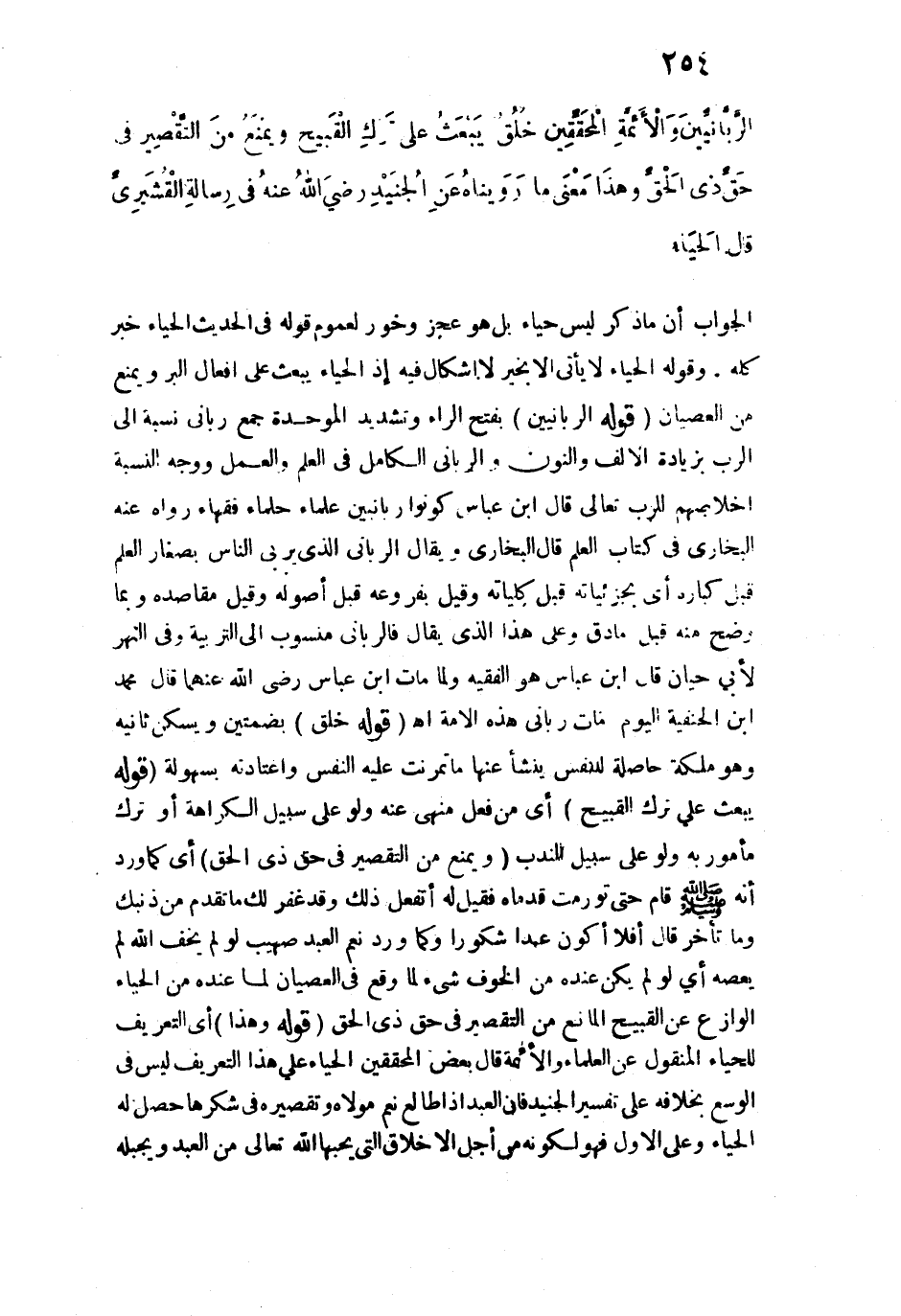 الجواب أن ما ذكر ليس حياء بل هو عجز وخور لعموم قوله في الحديث: الحياء خبر كله. وقوله الحياء لا يأتي إلا بخير لا إشكال فيه إذ الحياء يبعث على أفعال البر ويمنع من العصيان. قول، : (الربانيين) بفتح الراء وتشديد الموحدة جمع رباني نسبة إلى الرب بزيادة الألف والنون والرباني الكامل في العلم والعمل ووجه النسبة إخلاصهم للرب تعالى قال ابن عباس: كونوا ربانيين علماء حلفاء فقهاء رواه عنه البخاري في كتاب العلم قال البخاري ويقال الرباني الذي يربي النّاس بصغار العلم قبل كباره أي بجزئياته قبل كلياته وقيل: بفروعه قبل أصوله وقيل: مقاصده وبما وضح منه قبل ما دق وعلى هذا الذي يقال فالرباني منسوب إلى التربية وفي النهر لأبي حيان قال ابن عباس هو الفقيه ولما مات ابن عباس رضي الله عنهما قال محمد ابن الحنفية اليوم مات رباني هذه الأمة اهـ. قوله: (خلق) بضمتين ويسكن ثانيه وهو ملكه حاصله للنفس ينشأ عنها ما تمرنت عليه النفس واعتادته بسهولة. قوله: (ويبعث على ترك القبيح) أي من فعل منهى عنه ولو على سبيل الكراهة أو ترك مأمور به ولو على سبيل الندب (ويمنع من التقصير في حق ذي الحق) أي كما ورد أنه -صلى الله عليه وسلم- قام حتى تورمت قدماه فقيل له: أتفعل ذلك وقد غفر لك ما تقدم من ذنبك وما تأخر؟ قال: "أفلا أكون عبداً شكوراً" وكما ورد نعم العبد صهيب لو لم يخف الله لم يعصه أي لو لم يكن عنده من الخوف شيء لما وقع في العصيان لما عنده من الحياء الوازع عن القبيح المانع من التقصير في حق ذي الحق. قوله: (وهذا) أي التعريف للحياء المنقول عن العلماء والأئمة قال بعض المحققين: الحياء على هذا التعريف ليس في الوسع بخلافه على تفسير الجيد فإن العبد إذا طالع نعم مولاه وتقصيره في شكرها حصل له الحياء وعلى الأول فهو لكونه من أجل الأخلاق التي يحبها الله تعالى من العبد ويجبله