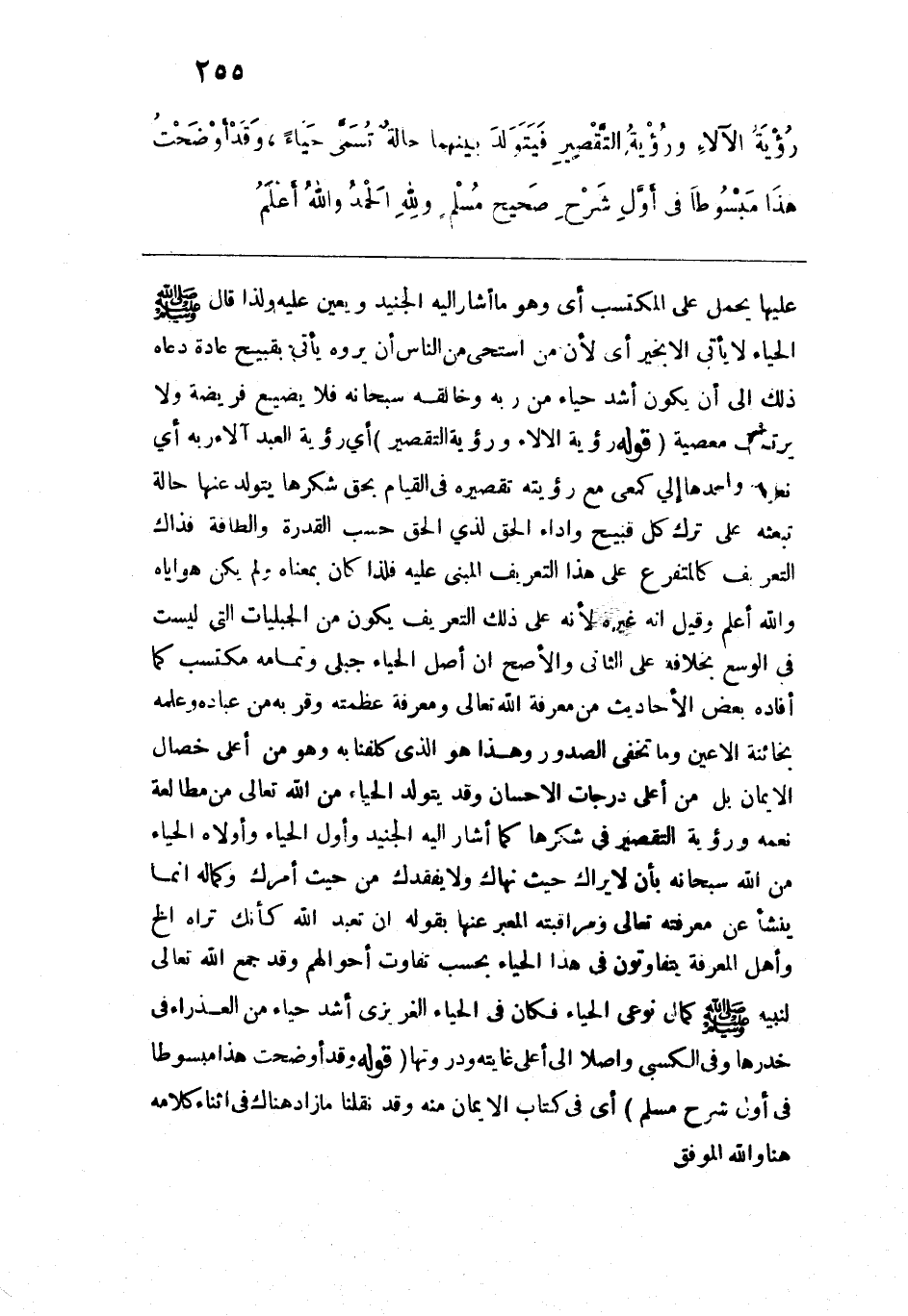 عليها يحمل على المكتسب أي وهو ما أشار إليه الجنيد ويعين عليه ولذا قال -صلى الله عليه وسلم-: "الحياء لا يأتي إلا بخير" أي لأن من استحى من النّاس أن يروه يأتي بقبيح عادة دعاه ذلك إلى أن يكون أشد حياء من ربه وخالقه سبحانه فلا يضيع فريضة ولا يرتكب معصية. قوله: (رؤية الآلاء ورؤية التقصير) أي رؤية العبد آلاء ربه أي نظر واحدها إلي كمعي مع رؤيته تقصيره في القيام بحق شكرها يتولد عنها حالة تبعثه على ترك كل قبيح وأداء الحق