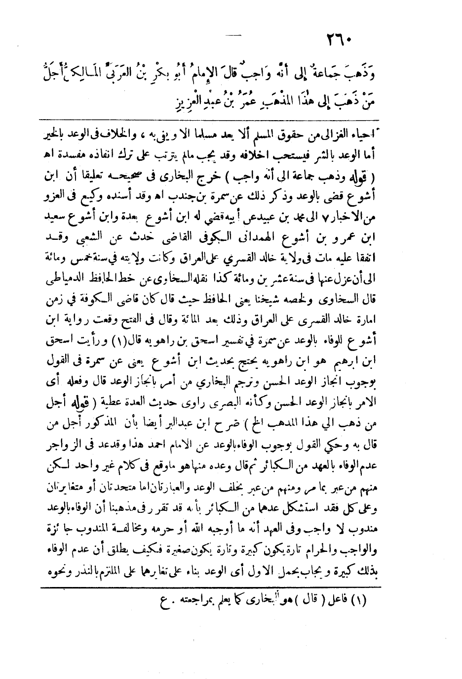فيستحب إخلافه وقد يجب ما لم يترتب على ترك إنفاذه مفسدة اهـ. قوله: (وذهب جماعة إلى أنه واجب) خرج البخاري في صحيحه تعليقاً أن ابن أشوع قضى بالوعد وذكر ذلك عن سمرة بن جندب اهـ. وقد أسنده وكيع في العزو من الأخبار إلى محمد بن عبيد عن أبيه قضى له ابن أشوع بعده وابن أشوع سعيد بن عمرو بن أشوع الهمذاني الكوفي القاضي حدث عن الشعبي وقد اتفقا عليه مات في ولاية خالد القسري على العراق وكانت ولايته في سنة خمس ومائة إلى أن عزل عنها في سنة عشرين ومائة كذا نقله السخاوي عن خط الحافظ الدمياطي قال السخاوي ولخصه شيخنا يعني الحافظ حيث قال: كان قاضي الكوفة: في زمن إمارة خالد القسري على العراق وذلك بعد المائة وقال في الفتح وقعت رواية ابن أشوع للوفاء بالوعد عن سمرة في تفسير إسحاق بن راهويه قال: ورأيت إسحاق بن إبراهيم هو ابن راهويه يحتج بحديث ابن أشوع يعني عن سمرة في القول بوجوب إنجاز الوعد الحسن وترجم البخاري من أمر بإنجاز الوعد قال: وفعله أي الأمر بإنجاز الوعد الحسن وكأنه البصري راوي حديث العدة عطية. قوله: (أجل من ذهب إلى هذا المذهب الخ) صرح ابن عبد البر أيضاً بأن المذكور أجل من قال به وحكى القول بوجوب الوفاء بالوعد عن الإِمام أحمد هذا وقد عد في الزواجر عدم الوفاء بالعهد من الكبائر ثم قال: وعده منها هو ما وقع في كلام غير واحد لكن منهم من عبر بما مر ومنهم من عبر بخلف الوعد والعبارتان إما متحدتان أو متغايرتان وعلى كل فقد استشكل عدهما من الكبائر بأنه قد تقرر في مذهبنا أن الوفاء بالوعد مندوب لا واجب وفي العهد أنه ما أوجبه الله أو حرمه ومخالفة المندوب جائزة والوجب والحرام تارة يكون كبيرة وتارة يكون صغيرة فكيف يطلق أن عدم الوفاء بذلك كبيرة ويجاب بحمل الأول أي الوعد بناء على تغايرهما على الملتزم بالنذر ونحوه