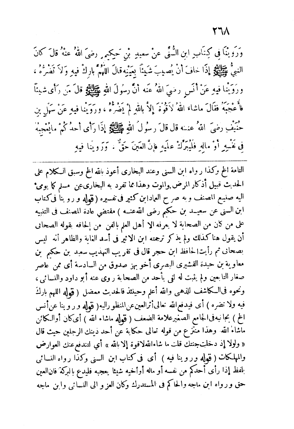 قوله: (وروينا في كتاب ابن السني عن سعيد بن حكيم رضي الله عنه) مقتضى عادة المصنف في التنبيه على من كان من الصحابة لا يعرفه إلا أهل العلم بالفن من إلحاقه بقوله الصحابي أن يقول هنا كذلك ولم يذكر ترجمته ابن الأثير في أسد الغابة والظاهر أنه ليس بصحابي ثم رأيت الحافظ ابن حجر قال في تقريب التهذيب سعيد بن حكيم بن معاوية بن حيدة القشيري البصري أخو بهز صدوق من السادسة أي ممن عاصر صغار التابعين ولم يثبت له لقي بأحد من الصحابة روى عنه أبو داود والنسائي، ونحوه في الكاشف للذهبي والله أعلم، وحينئذٍ فالحديث معضل. قوله: (اللهم بارك فيه ولا تضره) أي فيدفع الله تعالى أثر العين عن المنظور إليه.