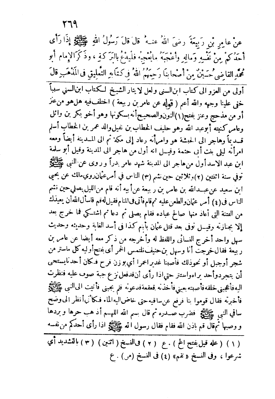 أولى من العزو إلى كتاب ابن السني ولعل لا ثار الشيخ لكتاب ابن السني سبباً خفى علينا وجهه والله أعلم. قوله: (عن عامر بن ربيعة) اختلف فيه هل هو من عنز أو مذحج وعنز بفتح النون والصحيح أنه بسكونها وهو أخو بكر بن وائل وعامر كنيته أبو عبد الله وهو حليف الخطاب ابن نفيل والد عمر بن الخطاب أسلم قديماً وهاجر إلى الحبشة هو وامرأته وعاد إلى مكة ثم إلى المدينة أيضاً ومعه امرأته ليلى بنت أبي جثمة وقيل: إنه أول من هاجر إلى المدينة وقيل: أبو سلمة بن عبد الأسد أول من هاجر إلى المدينة شهد عامر بدراً وروى عن النبي -صلى الله عليه وسلم- توفي سنة اثنتين وثلاثين حين نشم النّاس في أمر عثمان روى مالك عن يحيى بن سعيد عن عبد الله بن عامر بن ربيعة عن أبيه أنه قام من الليل يصلي حين نشم النّاس في أمر عثمان والطعن عليه ثم قام فأتى في المنام فقيل له: قم فاسأل الله أن يعيذك من الفتنة التي أعاذ منها صالح عباده، فقام يصلي ثم دعا ثم اشتكى فما خرج بعد إلا بجنازته وقيل: توفي بعد قتل عثمان بأيام كذا في أسد الغابة وحديثه وحديث سهل واحد أخرج النسائي واللفظ له وأخرجه من ذكر معه أيضاً عن عامر بن ربيعة فقال: خرجت أنا وسهل بن حنيف نلتمس الخمر أي بفتح أوليه كل ما ستر من شجر أو جبل أو نحو ذلك فأصبنا غديراً خمراً أي بوزن فرح فكان أحدنا يستحي أن يتجرد وأحد يراه واستتر حتى إذا رأى أن في فعل نزع جبة صوف عليه فنظرت إليه فأعجبني خلقه فأصبته بعيني فأخذته قعقعة فدعوته فلم يجبني فأتيت إلى النبي -صلى الله عليه وسلم- فأخبرته فقال: "قوموا بنا فرفع عن ساقيه حتى خاض إليه الماء" فكأني أنظر إلى وضح ساقي النبي -صلى الله عليه وسلم- فضرب صدره ثم قال: "بسم الله، اللهم أذهب حرها وبردها ووصبها" ثم قال: "قم بإذن الله" فقام فقال رسول الله -صلى الله عليه وسلم-: "إذا رأى أحدكم من نفسه