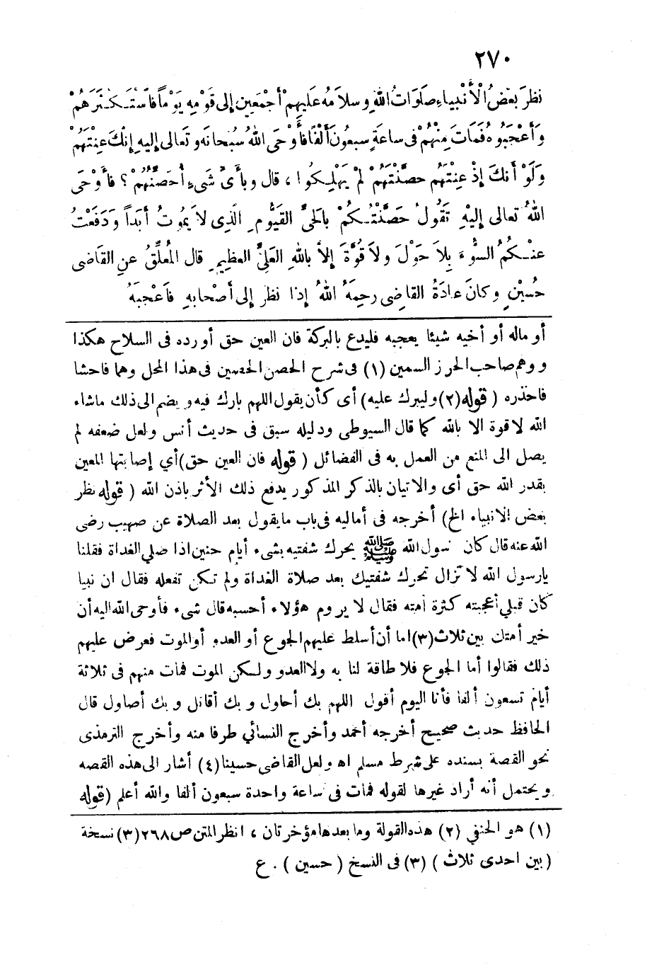 رسول الله لا تزال تحرك شفتيك بعد صلاة الغداة ولم تكن تفعله فقال: "إن نبياً كان قبلي أعجبته كثرة أمته فقال: لا يروم هؤلاء أحسبه قال شيء فأوحى الله إليه أن خير أمتك بين ثلاث إما أن أسلط عليهم الجوع أو العدو أو الموت فعرض عليهم ذلك فقالوا: أما الجوع فلا طاقة لنا به ولا العدو ولكن الموت فمات منهم في ثلاثة أيام تسعون ألفاً فأنا اليوم أقول: اللهم بك أحاول وبك أقاتل وبك أصاول" قال الحافظ: حديث صحيح أخرجه أحمد وأخرج النسائي طرفاً منه وأخرج الترمذي نحو القصة بسنده على شرط مسلم اهـ، ولعل القاضي حسيناً أشار إلى هذه القصة ويحتمل أنه أراد غيرها لقوله فمات في ساعة واحدة سبعون ألفاً والله أعلم. قوله: