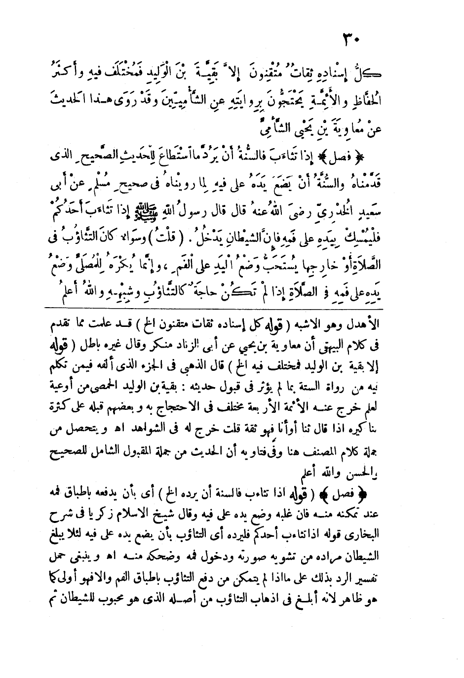 يده على فيه وقال شيخ الإسلام زكريا في شرح البخاري قوله: إذا تثاءب أحدكم فليرده أي التثاؤب بأن يضع يده على فيه لئلا يبلغ الشيطان مراده من تشويه صورته ودخول فمه وضحكه منه اهـ. وينبغي حمل تفسير الرد بذلك على ما إذا لم يتمكن من دفع التثاؤب بإطباق الفم وإلا فهو أولى كما هو ظاهر لأنه أبلغ في إذهاب التثاؤب من أصله الذي هو محبوب للشيطان ثم