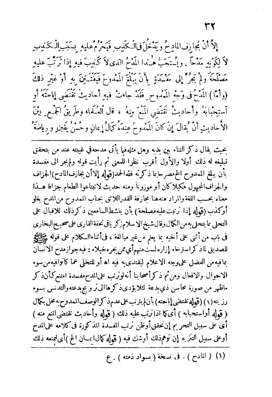 إلا أن يجازف المادح ويدخل في الكذب، فيحرم عليه بسبب الكذب لا لكونه مدحاً، ويستحب هذا المدح الذي لا كذب فيه إذا ترتب عليه مصلحة ولم يجرَّ إلى مفسدة بأن يبلغ الممدوح فيفتتن به، أو غير ذلك. وأما المدح في وجه الممدوح فقد جاءت فيه أحاديث تقتضي إباحته أو استحبابة، وأحاديث تقتضي المنع منه.