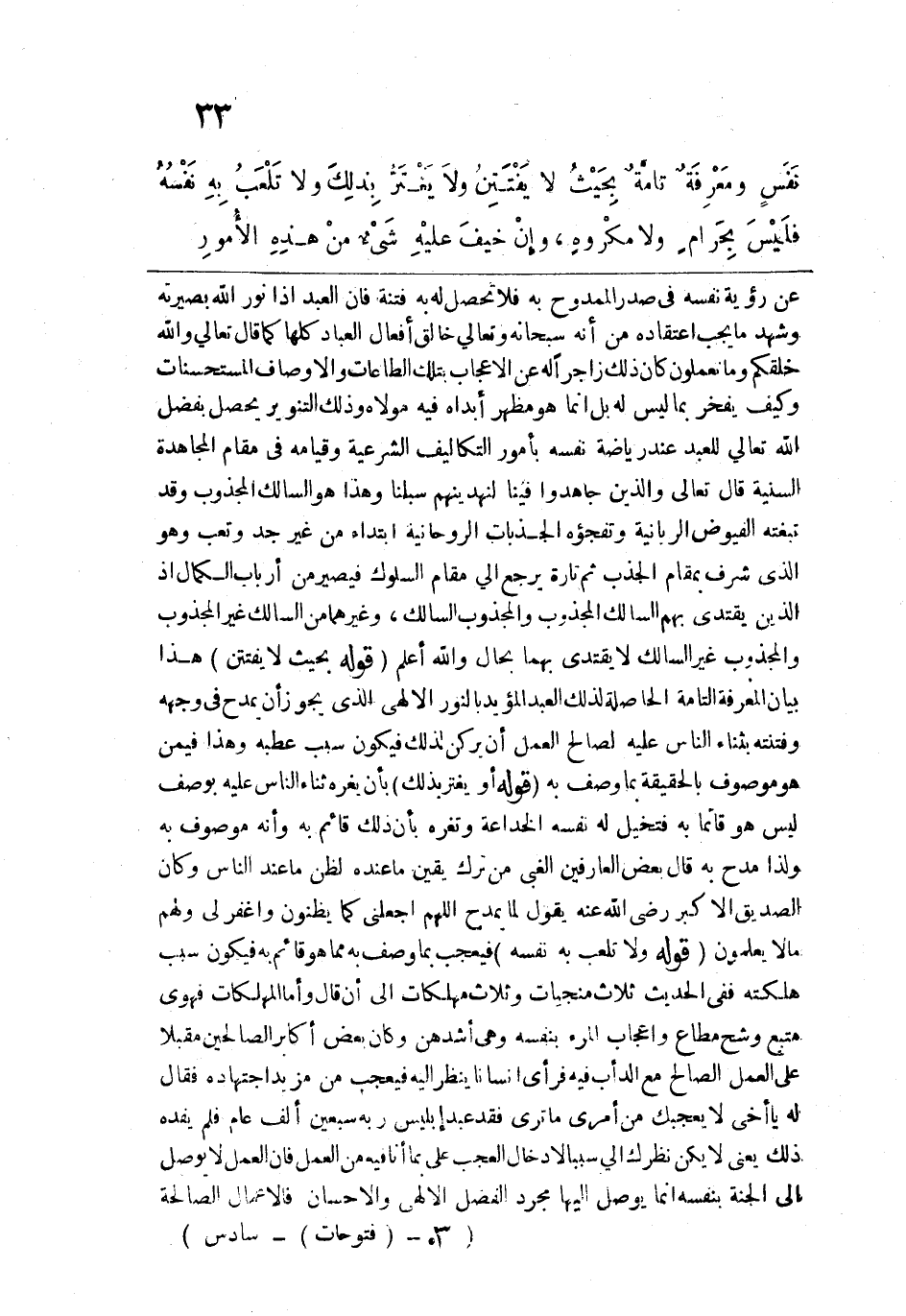 بوصف ليس هو قائماً به فتخيل له نفسه الخداعة وتغره بأن ذلك قائم به وأنه موصوف به ولذا مدح به قال بعض العارفين الغبي من ترك يقين ما عنده لظن ما عند النّاس وكان الصديق الأكبر رضي الله عنه يقول لما يمدح اللهم اجعلني كما يظنون واغفر لي ولهم ما لا يعلمون. قوله: (ولا تلعب به نفسه) فيعجب بما وصف به مما هو قائم به فيكون سبب هلكته ففي الحديث ثلاث منجيات وثلاث مهلكات إلى أن قال: وأما المهلكات فهوى متبع وشح مطاع وإعجاب المرء بنفسه وهي أشدهن وكان بعض أكابر الصالحين مقبلاً على العمل الصالح مع الدأب فيه فرأى إنساناً ينظر إليه فيعجب من مزيد اجتهاده فقال له: يا أخي لا يعجبك من أمري ما ترى فقد عبد إبليس ربه سبعين ألف عام فلم يفده ذلك يعني لا يكن نظرك إلي سبباً لإدخال العجب علي بما أنا فيه من العمل فإن العمل لا يوصل إلى الجنة بنفسه إنما يوصل إليها مجرد الفضل الإلهي والإحسان فالأعمال الصالحة