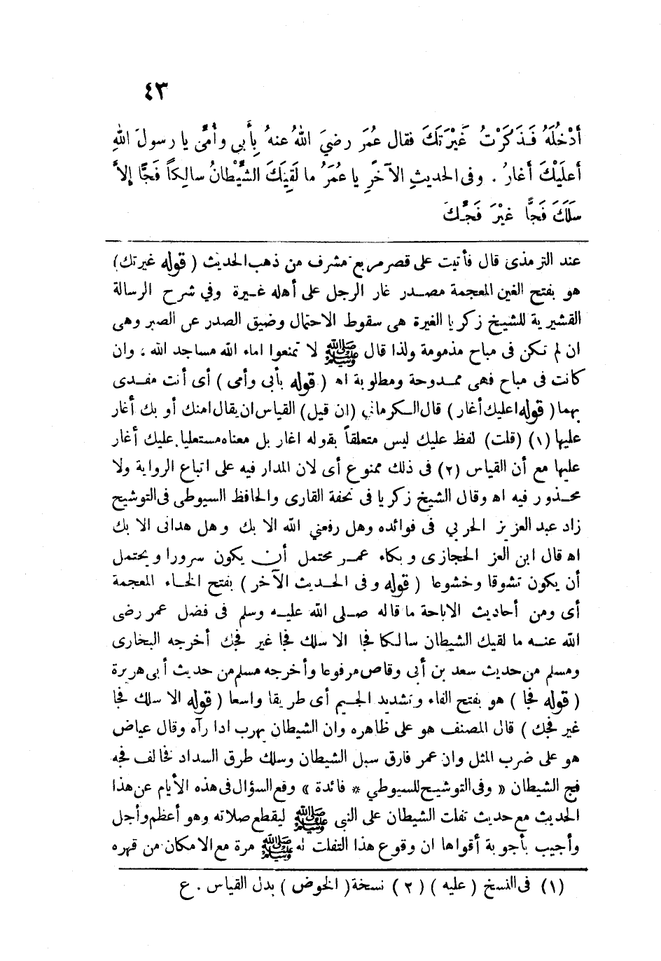 عند الترمذي قال: فأتيت على قصر مربع مشرف من ذهب الحديث. قوله: (غيرتك) هو بفتح الغين المعجمة مصدر غار الرجل على أهله غيرة وفي شرح الرسالة القشيرية للشيخ زكريا المغيرة هي سقوط الاحتمال وضيق الصدر عن الصبر وهي إن لم تكن في مباح مذمومة ولذا قال -صلى الله عليه وسلم- "لا تمنعوا إماء الله مساجد الله، وإن كانت في مباح فهي ممدوحة ومطلوبة" اهـ. قوله: (بأبي وأمي) أي أنت مفدي بهما. قوله: (أعليك أغار) قال الكرماني (إن قيل) القياس أن يقال: أمنك أو بك أغار عليها (قلت) لفظ عليك ليس متعلقاً بقوله أغار بل معناه مستعلياً عليك أغار عليها مع أن القياس في ذلك ممنوع أي لأن المدار فيه على اتباع الرواية ولا محذور فيه اهـ. وقال الشيخ زكريا في تحفة القاري والحافظ السيوطي في التوشيح زاد عبد العزيز الحربي في فوائده وهل رفعني الله إلا بك وهل هداني إلا بك اهـ. قال ابن العز الحجازي وبكاء عمر محتمل أن يكون سروراً ويحتمل أن يكون تشوقاً وخشوعاً. قوله: (وفي الحديث الآخر) بفتح الخاء المعجمة أي ومن أحاديث الإباحة ما قاله -صلى الله عليه وسلم- في فضل عمر رضي الله عنه ما لقيك الشيطان سالكاً فجاً إلا سلك فجاً غير فجك أخرجه البخاري ومسلم من حديث سعد بن أبي وقاص مرفوعاً وأخرجه مسلم من حديث أبي هريرة. قوله: (فجاً) هو بفتح الفاء وتشديد الجيم أي طريقاً واسعاً. قوله: (إلا سلك فجاً غير فجك) قال المصنف هو على ظاهر وأن الشيطان يهرب إذا رآه وقال عياض: هو على ضرب المثل وأن عمر فارق سبل الشيطان وسلك طرق السداد فخالف فجه فج الشيطان "وفي التوشيح للسيوطي".
