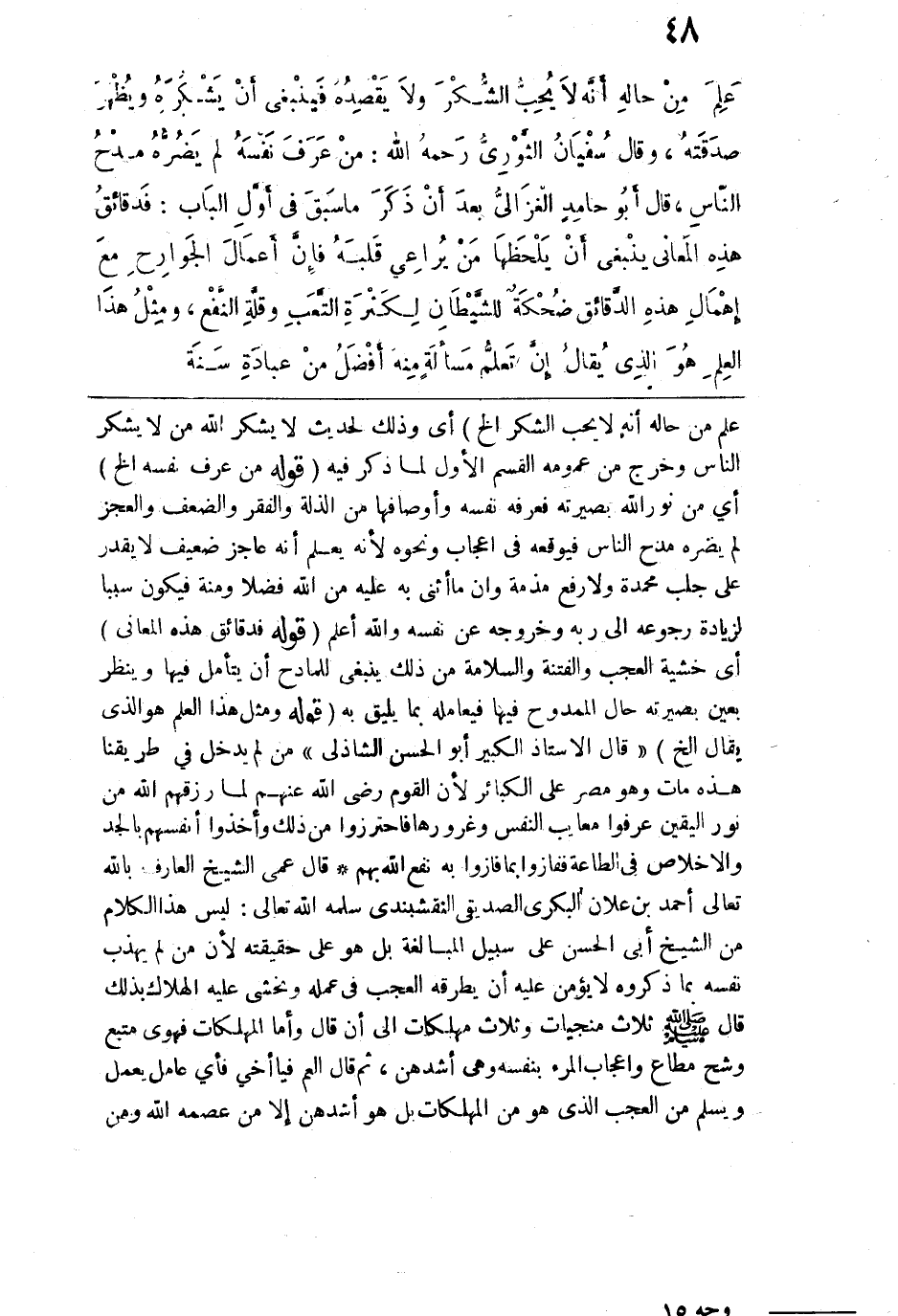 قال عمي الشيخ العارف بالله تعالى أحمد بن علان البكري الصديقي النقشبندي سلمه الله تعالى: ليس هذا الكلام من الشيخ أبي الحسن على سبيل المبالغة بل هو على حقيقته لأن من لم يهذب نفسه بما ذكروه لا يؤمن عليه أن يطرقه العجب في عمله ويخشى عليه الهلاك بذلك قال -صلى الله عليه وسلم-: "ثلاث منجيات وثلاث مهلكات" إلى أن قال وأما المهلكات فهوى متبع وشح مطاع وإعجاب المرء بنفسه وهي أشدهن، ثم قال العم: فيا أخي فأي عامل يعمل ويسلم من العجب الذي هو من المهلكات بل هو أشدهن إلا من عصمه الله ومن