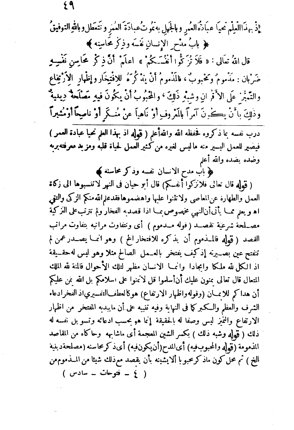 قال الله تعالى: {فَلَا تُزَكُّوا أَنْفُسَكُمْ} [النجم: 32] اعلم أن ذِكْر محاسن نفسه ضربان: مذموم؟ ومحبوب، فالمذموم أن يذكره للافتخار وإظهار الارتفاع والتميز على الأقران وشبه