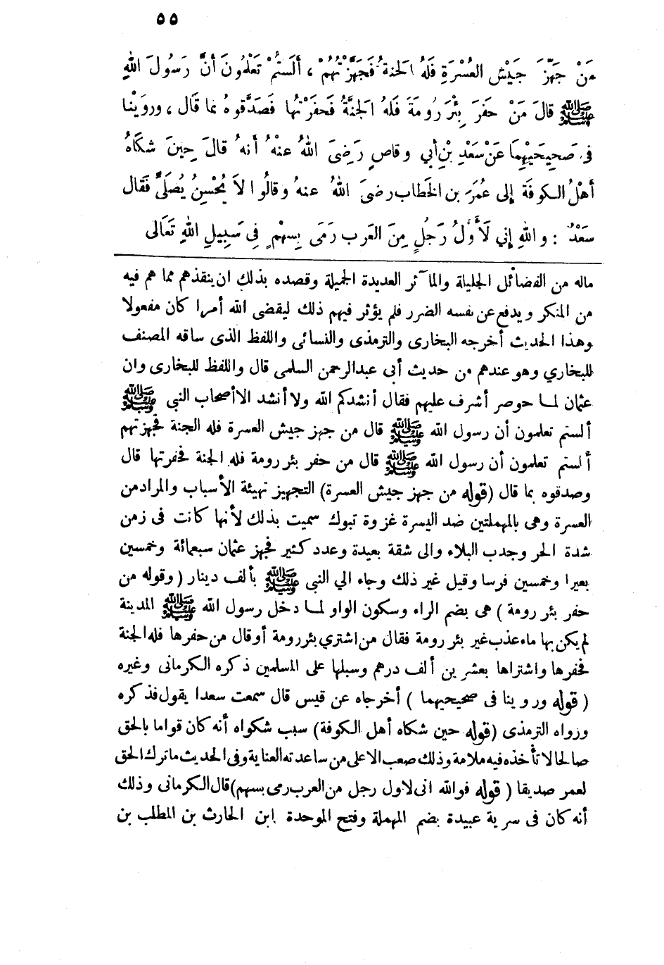 "مَنْ جهَّزَ جَيشَ العُسْرَةِ فَلَهُ الجَنَّةُ؟ فجهزتُهم، ألستم تعلمون أن رسول الله -صلى الله عليه وسلم- قال: مَنْ حَفَرَ بِئْرَ رُومَةَ فَلَهُ الجَنَّةُ، فحفرتُها؟ فصدَّقوه بما قال".