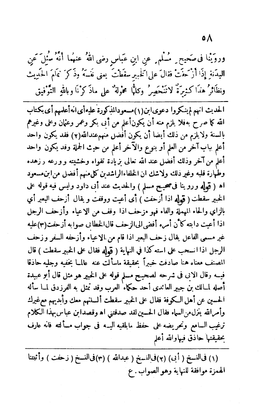 الحديث أنهم لم ينكروا دعوى ابن مسعود المذكورة عليه أي أنه أعلمهم أي بكتاب الله كما صرح به فلا يلزم منه أن يكون أعلم من أبي بكر وعمر وعثمان وعلي وغيرهم بالسنة ولا يلزم من ذلك أيضاً أن يكون أفضل منهم عند الله فقد يكون واحد أعلم بباب آخر من العلم أو بنوع والآخر أعلم من حيث الجملة وقد يكون واحد أعلم من آخر وذلك أفضل عند الله تعالى بزيادة تقواه وخشيته وورعه وزهده وطهارة قلبه وغير ذلك ولا شك أن الخلفاء الراشدين كل منهم أفضل من ابن مسعود اهـ. قوله: (وروينا في صحيح مسلم) والحديث عند أبي داود وليس فيه قوله على الخبير سقطت. قوله: (إذا أزحفت) أي أعيت ووقفت ويقال: أزحف البعير أي بالزاي والحاء المهملة والفاء فهو مزحف إذا وقف من الأعياء وأزحف الرجل إذا أعيت دابته كأن أمره أفضى إلى الزحف قال الخطابي صوابه أزحفت عليه غير مسمى الفاعل يقال: زحف البعير إذا قام من الأعياء وأزحفه السفر وزحف الرجل إذا انسحب على استه كذا في النهاية. قوله: (فقال على الخبير سقطت) قال المصنف معناه هنا صادفت خبيراً بحقيقة ما سألت عنه عالماً بخفيه وجليه حاذقاً فيه وقال الأبي في شرحه لصحيح مسلم قوله على الخبير هو مثل قال أبو عبيدة أصله لمالك بن جبير العائدي أحد حكماء العرب وقد تمثل به الفرزدق لما سأله الحسين عن أهل الكوفة: فقال على الخبير سقطت ألسنتهم معك وأيديهم مع غيرك وأمر الله ينزل من السماء فقال الحسين: لقد صدقتني اهـ. وقصد ابن عباس بهذا الكلام ترغيب السامع وتحريضه على حفظ ما يلقيه إليه في جواب مسألته فإنه عارف بحقيقتها حاذق فيها والله أعلم.