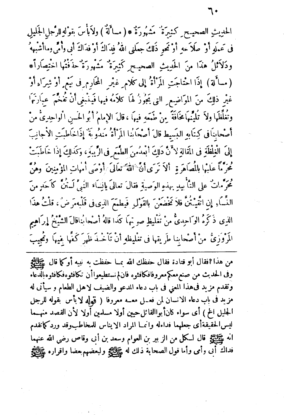 قال الإِمام أبو الحسن الواحدي من أصحابنا في كتابه "البسيط": قال أصحابنا: المرأة مندوبة إذا خاطبت الأجانب إلى الغلظة في المقالة، لأن ذلك أبعدُ من الطمع في الزيبة، وكذلك إذا خاطبت محرَّماً عليها بالمصاهرة، ألا ترى أن الله تعالى أوصى أمهاتِ المؤمنين وهن محرَّمات على التأبيد بهذه الوصية، فقال تعالى: {يَا نِسَاءَ النَّبِيِّ لَسْتُنَّ كَأَحَدٍ مِنَ النِّسَاءِ إِنِ اتَّقَيْتُنَّ فَلَا تَخْضَعْنَ بِالْقَوْلِ فَيَطْمَعَ الَّذِي فِي قَلْبِهِ مَرَضٌ} [الأحزاب: 32].