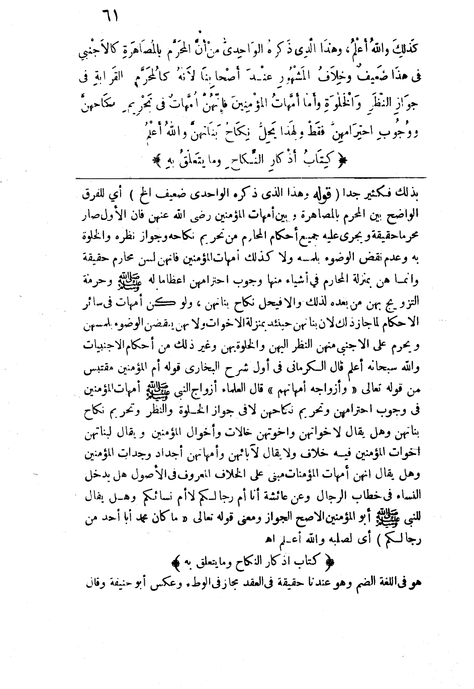 قوله: (وهذا الذي ذكره الواحدي ضعيف الخ) أي للفرق الواضح بين المحرم بالمصاهرة وبين أمهات المؤمنين رضي الله عنهن فإن الأول صار محرماً حقيقة ويجري عليه جميع أحكام المحارم من تحريم نكاحه وجواز نظره والخلوة به وعدم نقض الوضوء بلمسه ولا كذلك أمهات المؤمنين فإنهن لسن محارم حقيقة وإنما هن بمنزلة المحارم في أشياء منها وجوب احترامهن أعظاماً له -صلى الله عليه وسلم- وحرمة التزويج بهن من بعده لذلك وإلا فيحل نكاح بناتهن، ولو كن أمهات في سائر الأحكام لما جاز ذلك لأن بناتهن حينئذٍ بمنزلة الأخوات ولا بهن ينقصن الوضوء بلمسهن ويحرم على الأجنبي منهن النظر إليهن والخلوة بهن وغير ذلك من أحكام الأجنبيات والله سبحانه أعلم قال الكرماني في أول شرح البخاري قوله: أم المؤمنين مقتبس من قوله تعالى: {وَأَزواجُهُ أُمهَاتُهُم} قال العلماء: أزواج النبي -صلى الله عليه وسلم- أمهات المؤمنين في وجوب احترامهن وتحريم نكاحهن لا في جواز الخلوة والنظر وتحريم نكاح بناتهن وهل يقال لأخواتهن وأخوتهن خالات وأخوال المؤمنين ويقال لبناتهن أخوات المؤمنين فيه خلاف ولا يقال لآبائهن وأمهاتهن أجداد وجدات المؤمنين وهل يقال إنهن أمهات المؤمنات مبني على الخلاف المعروف في الأصول هل يدخل النساء في خطاب الرجال وعن عائشة أنا أم رجالكم لا أم نسائكم وهل يقال للنبي -صلى الله عليه وسلم- أبو المؤمنين الأصح الجواز ومعنى قوله تعالى: {ومَا كاَنَ مُحَمَّدٌ أَبَاَ أَحَدٍ مِنْ رِجَالِكُم} أي لصلبه والله أعلم اهـ.