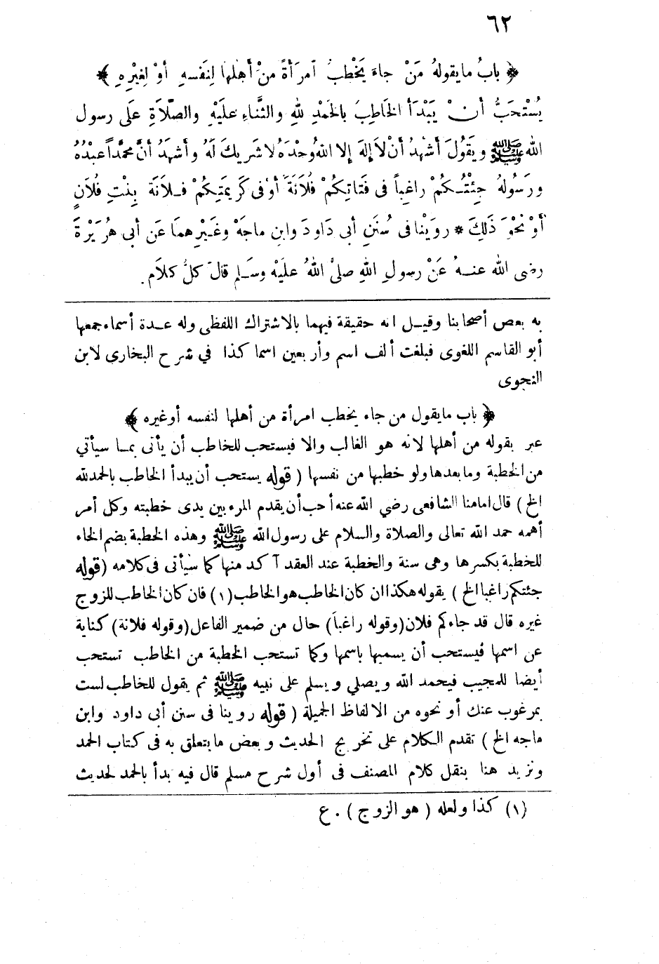 عبر بقوله من أهلها لأنه هو الغالب وإلا فيستحب للخاطب أن يأتي بما سيأتي من الخطبة وما بعدها ولو خطبها من نفسها. قوله: (يستحب أن يبدأ الخاطب بالحمد الله الخ) قال إمامنا الشافعي رضي الله عنه: أحب أن يقدم المرء بين يدي خطبته وكل أمر أهمه حمد الله تعالى والصلاة والسلام على رسول الله -صلى الله عليه وسلم- وهذه الخطبة بضم الخاء للخطبة بكسرها وهي سنة والخطبة عند العقد آكد منها كما سيأتي في كلامه. قوله: (جئتكم راغباً الخ) يقوله هكذا إن كان الخاطب هو الخاطب فإن كان الخاطب للزوج غيره قال: قد جاءكم فلان. وقوله: (راغباً) حال من ضمير الفاعل. وقوله: (فلانة) كناية عن اسمها فيستحب أن يسميها باسمها وكما تستحب الخطبة من الخاطب تستحب أيضاً للمجيب فيحمد الله ويصلي ويسلم على نبيه - صلى الله عليه وسلم - ثم يقول للخاطب: لست بمرغوب عنك أو نحوه من الألفاظ الجميلة.