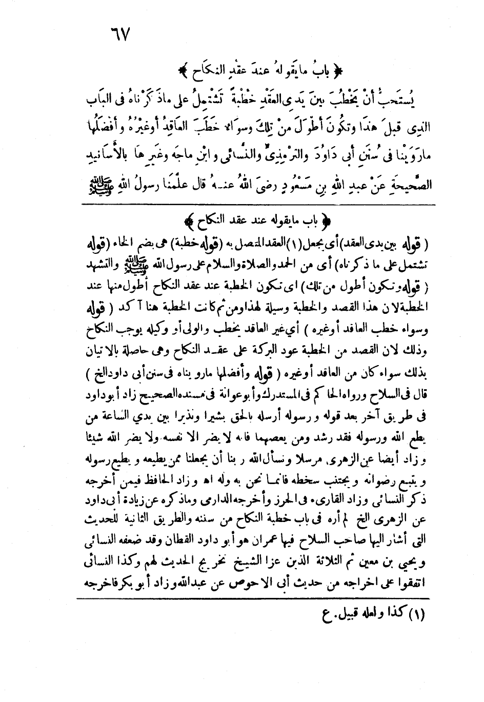 قوله: (وأفضلها ما رويناه في سنن أبي داود الخ) قال في السلاح ورواه الحاكم في المستدرك وأبو عوانة في مسنده الصحيح زاد أبو داود في طريق آخر بعد قوله ورسوله أرسله بالحق بشيراً ونذيراً بين يدي الساعة من يطع الله ورسوله فقد رشد ومن يعصهما فإنه لا يضر إلا نفسه ولا يضر الله شيئاً وزاد أيضاً عن الزهري مرسلاً ونسأل الله ربنا أن يجعلنا ممن يطيعه ويطيع رسوله ويتبع رضوانه ويجتنب سخطه فإنما نحن به وله اهـ. وزاد الحافظ فيمن أخرجه ذكر النسائي وزاد القاريء في الحرز وأخرجه الدارمي وما ذكره عن زيادة أبي داود عن الزهري الخ لم أره في باب خطبة النكاح من سننه والطريق الثانية للحديث التي أشار إليها صاحب السلاح فيها عمران هو أبو داود القطان وقد ضعفه النسائي ويحيى بن معين ثم الثلاثة الذين عزا الشيخ تخريج الحديث لهم وكذا النسائي اتفقوا على إخراجه من حديث أبي الأحوص عن عبد الله وزاد أبو بكر فأخرجه