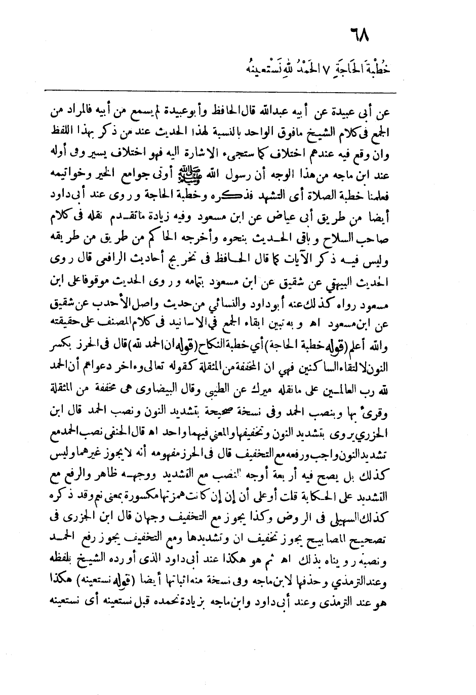 طريق من طريقه وليس فيه ذكر الآيات كما قال الحافظ في تخريج أحاديث الرافعي قال: روى الحديث البيهقي عن شقيق بتمامه وروى الحديث موقوفاً على ابن مسعود رواه كذلك عنه أبو داود والنسائي من حديث وأصل الأحدب عن شقيق عن ابن مسعود اهـ. وبه تبين إبقاء الجمع في الأسانيد في كلام المصنف على حقيقته والله أعلم. قوله: (خطبة الحاجة) أي خطبة النكاح. قوله: (إن الحمد لله) قال في الحرز بكسر النون لالتقاء الساكنين فهي أن المخففة من المثقلة كقوله تعالى: {وَآخِرُ دَعْوَاهُمْ أَنِ الْحَمْدُ لِلَّهِ رَبِّ الْعَالَمِينَ} [يونس: 10] على ما نقله ميرك عن الطيبي وقال البيضاوي هي مخففة من المثقلة وقريء بها وبنصب الحمد وفي نسخة صحيحة بتشديد النون ونصب الحمد قال ابن الجزري يروى بتشديد النون وتخفيفها والمعنى فيهما واحد اهـ. قال الحنفي نصب الحمد مع تشديد النون واجب ورفعه مع التخفيف قال في الحرز مفهومه أنه لا يجوز غيرهما وليس كذلك بل يصح فيه أربعة أوجه النصب مع التشديد ووجهه ظاهر والرفع مع التشديد على الحكاية قلت أو على أن إن إن كانت همزتها مكسورة بمعنى نعم وقد ذكره كذلك السهيلي في الروض وكذا يجوز مع التخفيف وجهان قال ابن الجزري في تصحيح المصابيح ويجوز تخفيف أن وتشديدها ومع التخفيف يجوز رفع الحمد ونصبه رويناه بذلك اهـ. ثم هو هكذا عند أبي داود الذي أورده الشيخ بلفظه وعند الترمذي وحذفها لابن ماجه وفي نسخة منه إثباتها أيضاً. قوله: (نستعينه) هكذا هو عند الترمذي وعند أبن داود وابن ماجه بزيادة تحمده قبل نستعينه أي نستعينه