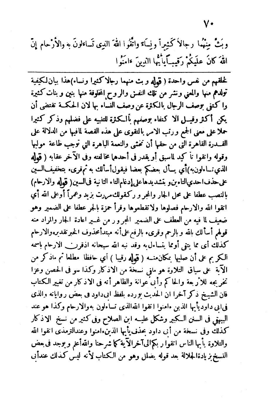 لخلقهم من نفس واحدة. قوله: (وبث منهما رجالاً كثيراً ونساء) هذا بيان لكيفية تولدهم منها والمعنى ونشر من تلك النفس والروح المخلوقة منها بنين وبنات كثيرة واكتفى بوصف الرجال بالكثرة عن وصف النساء بها لأن الحكمة تقتضي أن يكن أكثر وقيل الاكتفاء بوصفهم بالكثرة للتنبيه على فضلهم وذكر كثيراً حملاً على معنى الجمع ورتب الأمر بالتقوى على هذه القصة لما فيها من الدلالة على القدرة القاهرة التي من حقها أن تخشى والنعمة الباهرة التي توجب طاعة موليها وقوله: واتقوا تأكيد لما سبق أو يقدر في أحدهما مخالفته وفي الآخر عقابه. قوله: (الذي تساءلون به) أي يسأل بعضكم بعضاً فيقول أسألك به ثم قريء بتخفيف السين على حذف إحدى التاءين وبتشديدها على إدغام التاء الثانية في السين. قوله: (والأرحام) بالنصب عطفاً على محل الجار والمجرور كقولك مررت يزيد وعمراً أو على الله أي اتقوا الله والأرحام فصلوها ولا تقطعوها وقرأ حمزة بالجر عطفاً على الضمير وهو ضعيف لما فيه من العطف على الضمير المجرور من غير إعادة الجار والمراد منه قولهم أسألك بالله وبالرحم وقريء بالرفع على أنه مبتدأ محذوف الخبر تقديره والأرحام كذلك أي مما يتقي أو مما يتساءل به وقد نبه الله سبحانه إذ قرن الأرحام باسمه الكريم على أن صليها بمكان منه. قوله: (رقيباً) أي حافظاً مطلعاً ثم ما ذكر من الآية على سياق التلاوة هو ما في نسخة من الأذكار وكذا هو في الحصن وعزا تخريجه للأربعة والحاكم وأبي عوانة والظاهر أنه في الأذكار من تغيير الكتاب فإن الشيخ ذكر آخراً أن الحديث يورده بلفظ أبي داود في بعض رواياته والذي في أبي داود {وَاتَّقُوا اللهَ الَّذِي تَسَاءَلُونَ بِهِ وَالْأَرْحَامَ} [النساء: 1] وكذا هو عند البيهقي في السنن الكبير وشكل عليه ابن الصلاح وشكل كثير من نسخ الأذكار كذلك وفي نسخة من أبي داود بحذف يأيها الذين ءامنوا وعند الترمذي اتقوا الله والتلاوة {يَا أَيُّهَا النَّاسُ اتَّقُوا رَبَّكُمُ} إلى آخر الآية كما شرحنا والله أعلم ويوجد في بعض النسخ بزيادة الجلالة بعد قوله: يضلل وهو من الكتاب لأنه ليس كذلك عند أبي