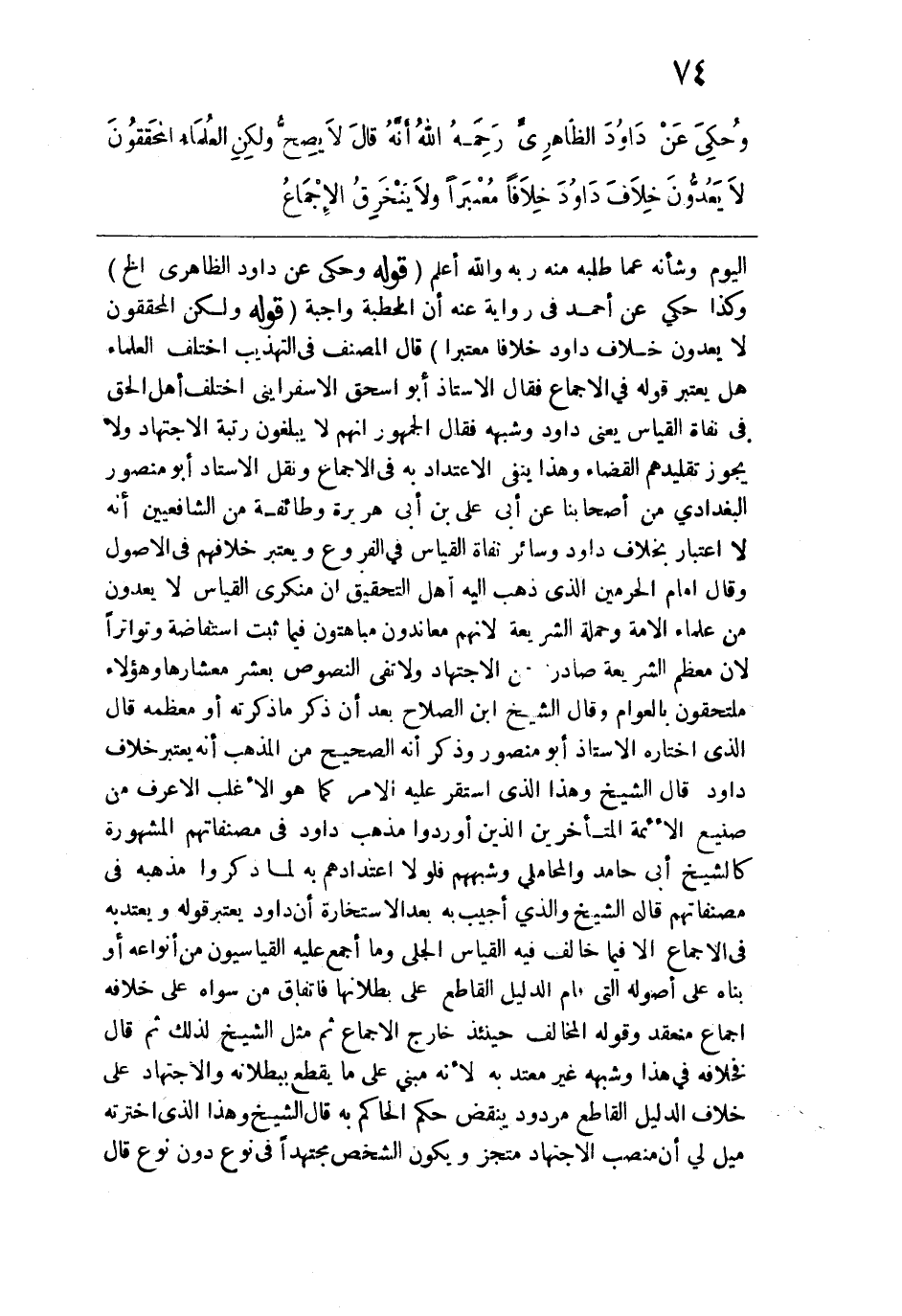 وسائر نفاة القياس في الفروع ويعتبر خلافهم في الأصول وقال إمام الحرمين الذي ذهب إليه أهل التحقيق أن منكري القياس لا يعدون من علماء الأمة وجملة الشريعة لأنهم معاندون مباهتون فيما ثبت استفاضة وتواتراً لأن معظم الشريعة صادرة عن الاجتهاد ولا تفي النصوص بعشر معشارها وهؤلاء ملتحقون بالعوام وقال الشيخ ابن الصلاح بعد أن ذكر ما ذكرته أو معظمه قال الذي اختاره الأستاذ أبو منصور وذكر أنه الصحيح من المذهب أنه يعتبر خلاف داود قال الشيخ وهذا الذي استقر عليه الأمر كما هو الأغلب الأعرف من صنيع الأئمة المتأخرين الذين أوردوا مذهب داود في مصنفاتهم المشهوررة كالشيخ أبي حامد والمحاملي وشبههم فلولا اعتدادهم به لما ذكروا مذهبه في مصنفاتهم قال الشيخ والذي أجيب به بعد الاستخارة أن داود يعتبر قوله ويعتد به في الإجماع إلا فيما خالف فيه القياس الجلي وما أجمع عليه القياسيون من أنواعه أو بناه على أصوله التي قام الدليل القاطع على بطلانها فاتفاق من سواه على خلافه إجماع منعقد وقوله المخالف حينئذٍ خارج الإجماع ثم مثل الشيخ لذلك ثم قال فخلافه في هذا وشبهه غير معتد به لأنه مبني على ما يقطع ببطلانه والاجتهاد على خلاف الدليل القاطع مردود ينقض حكم الحاكم به قال الشيخ وهذا الذي اخترته ميل لي أن منصب الاجتهاد متجز ويكون الشخص مجتهداً في نوع دون نوع قال: