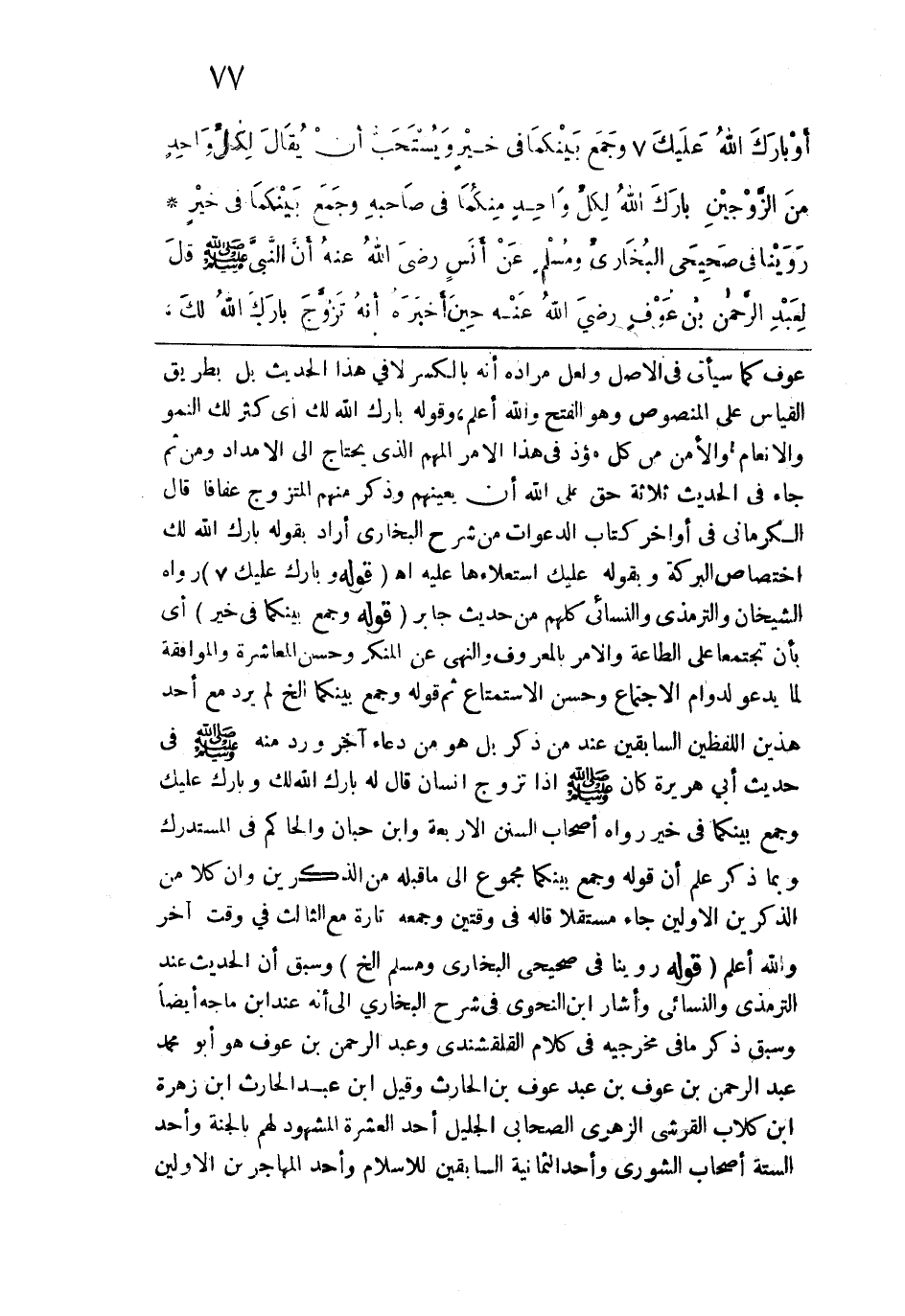 عوف كما سيأتي في الأصل ولعل مراده أنه بالكسر لا في هذا الحديث بل بطريق القياس على المنصوص وهو الفتح والله أعلم، وقوله: بارك الله لك أي كثر لك النمو والأنعام والأمن من كل مؤذ في هذا الأمر المهم الذي يحتاج إلى الأمداد ومن ثم جاء في الحديث ثلاثة حق على الله أن يعينهم وذكر منهم المتزوج عفافاً قال الكرماني في أواخر كتاب الدعوات من شرح البخاري أراد بقوله بارك الله لك اختصاص البركة وبقوله عليك استعلاءها عليه اهـ. قوله: (وبارك عليك) رواه الشيخان والترمذي والنسائي كلهم من حديث جابر. قوله: (وجمع بينكما في خير) أي بأن تجتمعا على الطاعة والأمر بالمعروف والنهي عن المنكر وحسن المعاشرة والموافقة لما يدعو لدوام الاجتماع حسن الاستمتاع ثم قوله وجمع بينكما الخ لم يرد مع أحدى هذين اللفظين السابقين عند من ذكر بل هو من دعاء آخر ورد منه -صلى الله عليه وسلم- في حديث أبي هريرة كان -صلى الله عليه وسلم- إذا تزوج إنسان قال له الله: بارك الله لك وبارك عليك وجمع بينكما في خير رواه أصحاب السنن الأربعة وابن حبان والحاكم في المستدرك وبما ذكر علم أن قوله وجمع بينكما مجموع إلى ما قبله من الذكرين وإن كلاً من الذكرين الأولين جاء مستقلاً قاله في وقتين وجمعه تارة مع الثالث في وقت آخر والله أعلم.