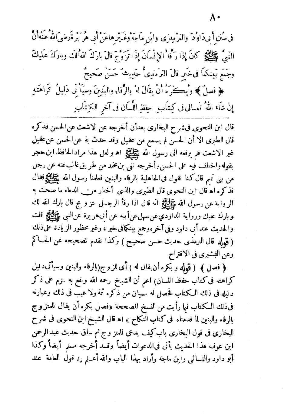 قوله: (ويكره أن يقال له) أي للزوج (بالرفاء والبنين وسيأتي دليل كراهته في كتاب حفظ اللسان) اعلم أن الشيخ رحمه الله ونفع به عزم على ذكر دليله في ذلك الكتاب فحصل له نسيان من ذكره ثمة ولا عيب في ذلك وعبارته في ذلك الكتاب فيما رأيت من النسخ المصححة.