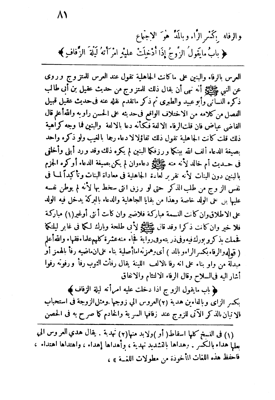العرس بالرفاء والبنين على ما كانت الجاهلية تقول عند العرس للمتزوج وروي عن النبي -صلى الله عليه وسلم- أنه نهى أن يقال ذلك للمتزوج من حديث عقيل بن أبي طالب ذكره النسائي وأبو عبيد والطبري ثم ذكر ما تقدم نقله عنه في حديث عقيل قبيل الفصل من كلامه من الاختلاف الواقع في حديثه على الحسن راويه والله أعلم قال القاضي عياض فإن قلت الرفاء الألفة فكأنه دعا بالألفة والبنين فما وجه كراهية ذلك قلت: كانت الجاهلية تقول تفاؤلاً لا دعاء رجماً بالغيب ولو ذكره واحد بصيغة الدعاء ألف الله بينكما ورزقكما البنين لم يكره ذلك وقد ورد أبلى وأخلقى في حديث أم خالد لأنه منه -صلى الله عليه وسلم- دعاء وإن لم يكن بصيغة الدعاء أو كره الجزم بالبنين دون البنات لأنه تقرير لعادة الجاهلية في معاداة البنات وتأكيداً لما في نفس الزوج من طلب الذكر حتى لو رزق أنثى سخط بها لأنه لم يوطن نفسه عليها بل على الولد خاصة وهذا من بقايا الجاهلية والدعاء بالبركة يدخل فيه الولد على الإطلاق وإن كانت النسمة مباركة فلا ضير وإن كانت أنثى أو غير مباركة فلا خير وإن كانت ذكراً وقد قال -صلى الله عليه وسلم- لأبي طلحة وبارك ليلتكما فحملت بذكر وبورك فيه وفي ذريته وفي رواية فجاء منه عشرة كلهم علماء فقهاء والله أعلم. قوله: (والرفاء بكسر الراء وبالمد) أي وهمزته إما أصلية بناء على أن ماضيه رفأ بالهمز أو مبدلة من واو بناء على أنه رفأ بالألف اللينة يقال رفأت الثوب رفأ ورفوته رفواً أشار إليه في السلاح وقال الرفاء الالتئام والاتفاق.