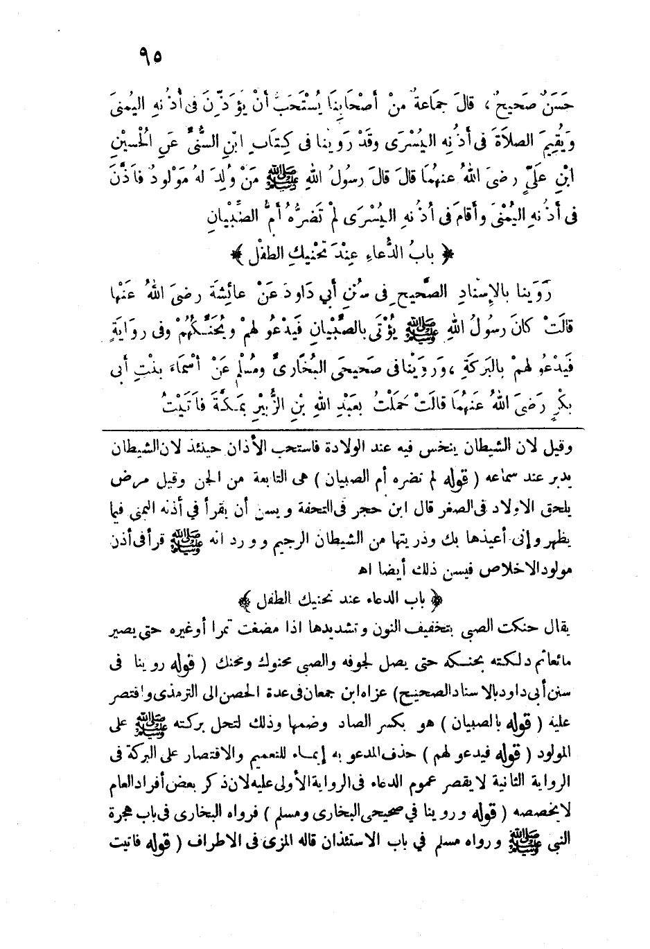 روينا بالإسناد الصحيح في سنن أبي داود عن عائشة رضي الله عنها قالت: "كان رسول الله -صلى الله عليه وسلم- يؤتى بالصبيان فيدعو لهم ويحنَّكهم" وفي رواية "فيدعو لهم بالبركة".