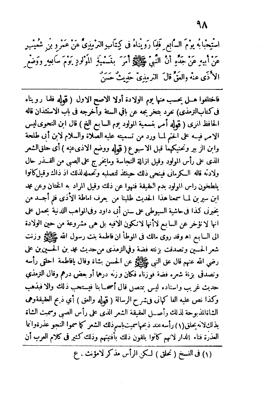 فاختلفوا هل يحسب منها يوم الولادة أولاً الأصح الأول. قوله: (فلما رويناه في كتاب الترمذي) تفرد بتخريجه عن باقي الستة وأخرجه في باب الاستئذان قاله الحافظ المزي. قوله: (أمر بتسمية المولود يوم السابع الخ) قال ابن النحوي ليس الأمر فيه على الحتم لما ورد من تسميته عليه الصلاة والسلام لابن أبي طلحة وابن الزبير وتحنيكهما قبل الأسبوع. قوله: (ووضع الأذى عنه) أي حلق الشعر الذي على رأس المولود وقيل إزالة النجاسة وما يخرج على الصبي من القذر حال ولادته قاله الكرماني فينحى ذلك حينئذٍ لتصلبه وتحمله لذلك إذ ذاك وقيل: كانوا يلطخون رأس المولود بدم العقيقة فنهوا عن ذلك وقيل المراد به الختان وعن محمد بن سيرين لما سمعنا هذا الحديث طلبنا من يعرف إماطة الأذى فلم أجد من يخبرني كذا في حاشية السيوطي على سنن أبي داود وفي المواهب اللدنية يحمل على أنها لا تؤخر عن السابع لا أنها لا تكون إلا فيه بل هي مشروعة من حين الولادة إلى السابع اهـ. وفي روى مالك في الموطأ أن فاطمة بنت رسول الله -صلى الله عليه وسلم- وزنت شعر الحسين وتصدقت بزنته فضة وفي الترمذي من حديث محمد بن الحسين بن علي رضي الله عنهم قال عن النبي -صلى الله عليه وسلم- عن الحسن بشاة وقال: يا فاطمة احلقي رأسه وتصدقي بزنة شعره فضة فوزناه فكان وزنه درهماً أو بعض درهم وقال الترمذي حديث غريب وإسناده ليس بمتصل قال أصحابنا: فيستحب ذلك وإلا فبذهب وكذا نص عليه الفاكهاني في شرح الرسالة. قوله: (والعق) أي ذبح العقيقة وهي الشاة المذبوحة لذلك وأصل العقيقة الشعر الذي على رأس الصبي وسميت الشاة بذلك لأنه يحلق رأسه عند ذبحها سميت باسم ذلك الشعر كما سموا النجو عذره وإنما العذرة فناء الدار لأنهم كانوا يلقون ذلك بأفنيتهم وذلك كثير في كلام العرب أن