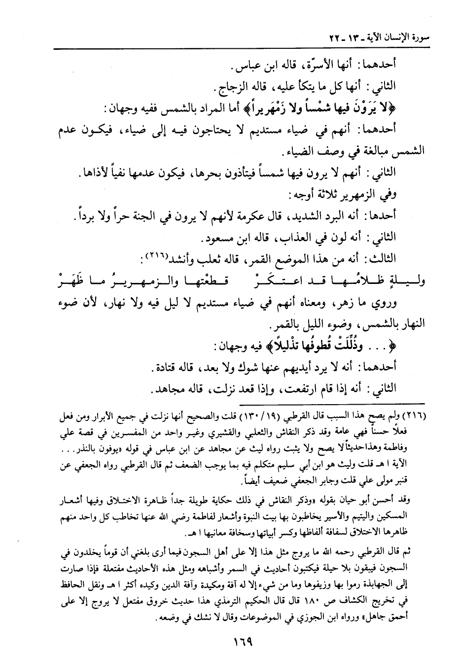 وروي ما زهر , ومعناه أنهم في ضياء مستديم لا ليل فيه ولا نهار , لأن ضوء النهار بالشمس , وضوء الليل بالقمر. { ... وذُلِّلّتْ قُطوفُها تذْليلاً} فيه وجهان: أحدهما: أنه لا يرد أيديهم عنها شوك ولا بعد، قاله قتادة. الثاني: أنه إذا قام ارتفعت , وإذا قعد نزلت، قاله مجاهد.
