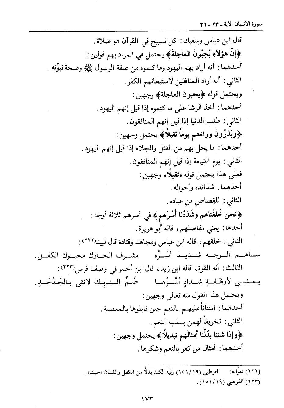 قال ابن عباس وسفيان: كل تسبيح في القرآن هو صلاة. {إنّ هؤلاءِ يُحِبّونَ العاجلةَ} يحتمل في المراد بهم قولين: أحدهما: أنه أراد بهم اليهود وما كتموه من صفة لرسول الله صلى الله عليه وسلم وصحة نبوّته. الثاني: أنه أراد المنافقين لاستبطانهم الكفر. ويحتمل قوله {يحبون العاجلة} وجهين: أحدهما: أخذ الرشا على ما كتموه إذا قيل إنهم اليهود. الثاني: طلب الدنيا إذا قيل إنهم المنافقون. {ويَذَرُونَ وراءَهم يوماً ثقيلاً} يحتمل وجهين: أحدهما: ما يحل بهم من القتل والجلاء إذا قيل إنهم اليهود. الثاني: يوم القيامة إذا قيل إنهم المنافقون. فعلى هذا يحتمل قوله (ثقيلاً) وجهين: أحدهما: شدائده وأحواله. الثاني: للقِصاص من عباده. {نحن خَلقْناهم وشَدَدْنا أَسْرَهم} في أسرهم ثلاثة أوجه: أحدها: يعني مفاصلهم , قاله أبو هريرة. الثاني: خلقهم , قاله ابن عباس ومجاهد وقتادة قال لبيد: