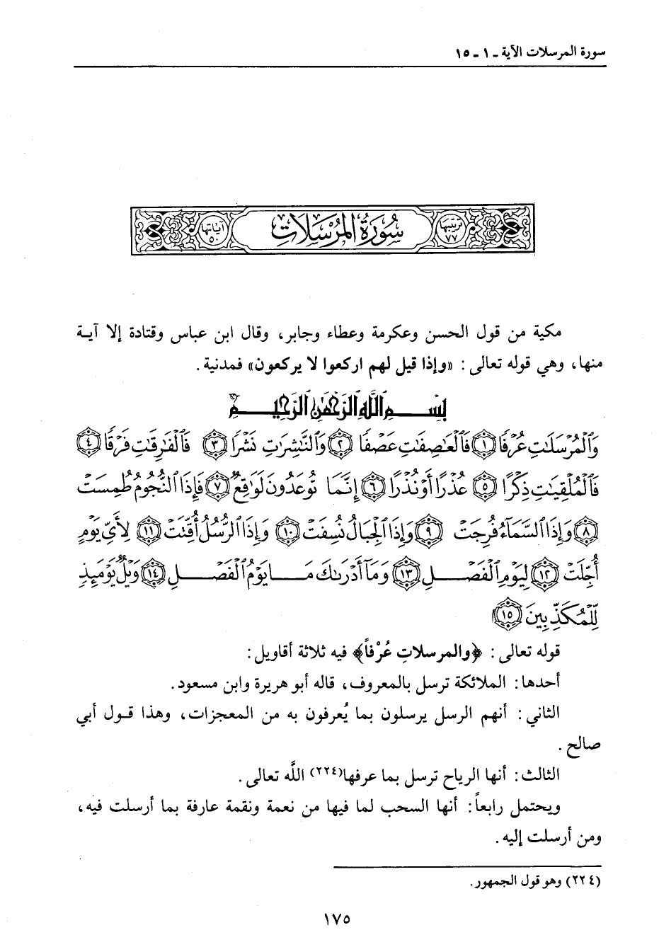 {والمرسلات عرفا فالعاصفات عصفا والناشرات نشرا فالفارقات فرقا فالملقيات ذكرا عذرا أو نذرا إنما توعدون لواقع فإذا النجوم طمست وإذا السماء فرجت وإذا الجبال نسفت وإذا الرسل أقتت لأي يوم أجلت ليوم الفصل وما أدراك ما يوم الفصل ويل يومئذ للمكذبين} قوله تعالى: {والمرسلات عُرْفاً} فيه ثلاثة أقاويل: أحدها: الملائكة ترسل بالمعروف , قاله أبو هريرة وابن مسعود. الثاني: أنهم الرسل يرسلون بما يُعرفون به من المعجزات , وهذا قول أبي صالح. الثالث: أنها الرياح ترسل بما عرفها الله تعالى. ويحتمل رابعاً: أنها السحب لما فيها من نعمة ونقمة عارفة بما أرسلت فيه , ومن أرسلت إليه.