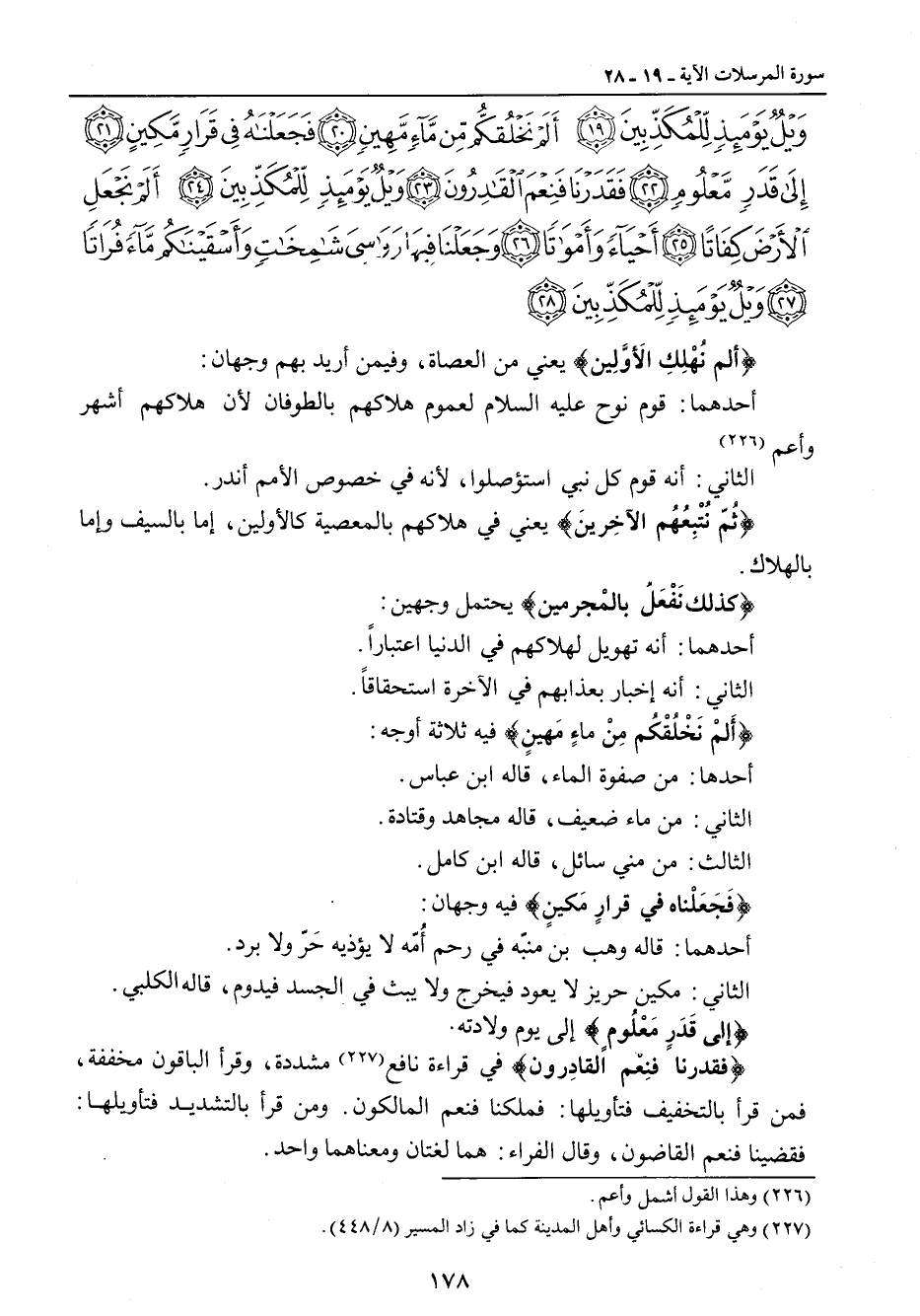 ويل يومئذ للمكذبين ألم نخلقكم من ماء مهين فجعلناه في قرار مكين إلى قدر معلوم فقدرنا فنعم القادرون ويل يومئذ للمكذبين ألم نجعل الأرض كفاتا أحياء وأمواتا وجعلنا فيها رواسي شامخات وأسقيناكم ماء فراتا ويل يومئذ للمكذبين} {ألم نُهلِكِ الأوَّلينِ} يعني من العصاة، وفيمن أريد بهم وجهان: أحدهما: قوم نوح عليه السلام لعموم هلاكهم بالطوفان لأن هلاكهم أشهر وأعم. الثاني: أنه قوم كل نبي استؤصلوا , لأنه في خصوص الأمم أندر. {ثُمّ نُتْبِعُهُم الآخِرينَ} يعني في هلاكهم بالمعصية كالأولين، إما بالسيف وإما بالهلاك. {كذلك نَفْعَلُ بالمْجرمين} يحتمل وجهين: أحدهمأ: أنه تهويل لهلاكهم في الدنيا اعتباراً. الثاني: أنه إخبار بعذابهم في الآخرة استحقاقاً. {أَلمْ نَخْلُقْكُم مِنْ ماءٍ مَهينٍ} فيه ثلاثة أوجه: أحدها: من صفوة الماء , قاله ابن عباس. الثاني: من ماء ضعيف , قاله مجاهد وقتادة. الثالث: من مني سائل , قاله ابن كامل. {فَجَعَلْناه في قرارٍ مَكينٍ} فيه وجهان: أحدهما: قاله وهب بن منبّه في رحم أُمّه لا يؤذيه حَرّ ولا برد. الثاني: مكين حريز لا يعود فيخرج ولا يبث في الجسد فيدوم , قاله الكلبي. {إلى قَدَرٍ مَعْلُومٍِ} إلى يوم ولادته. {فقدرنا فنِعْم القادِرون} في قراءة نافع مشددة , وقرأ الباقون مخففة , فمن قرأ بالتخفيف فتأويلها: فملكنا فنعم المالكون. ومن قرأ بالتشديد فتأويلها: فقضينا فنعم القاضون , وقال الفراء: هما لغتان ومعناهما واحد.
