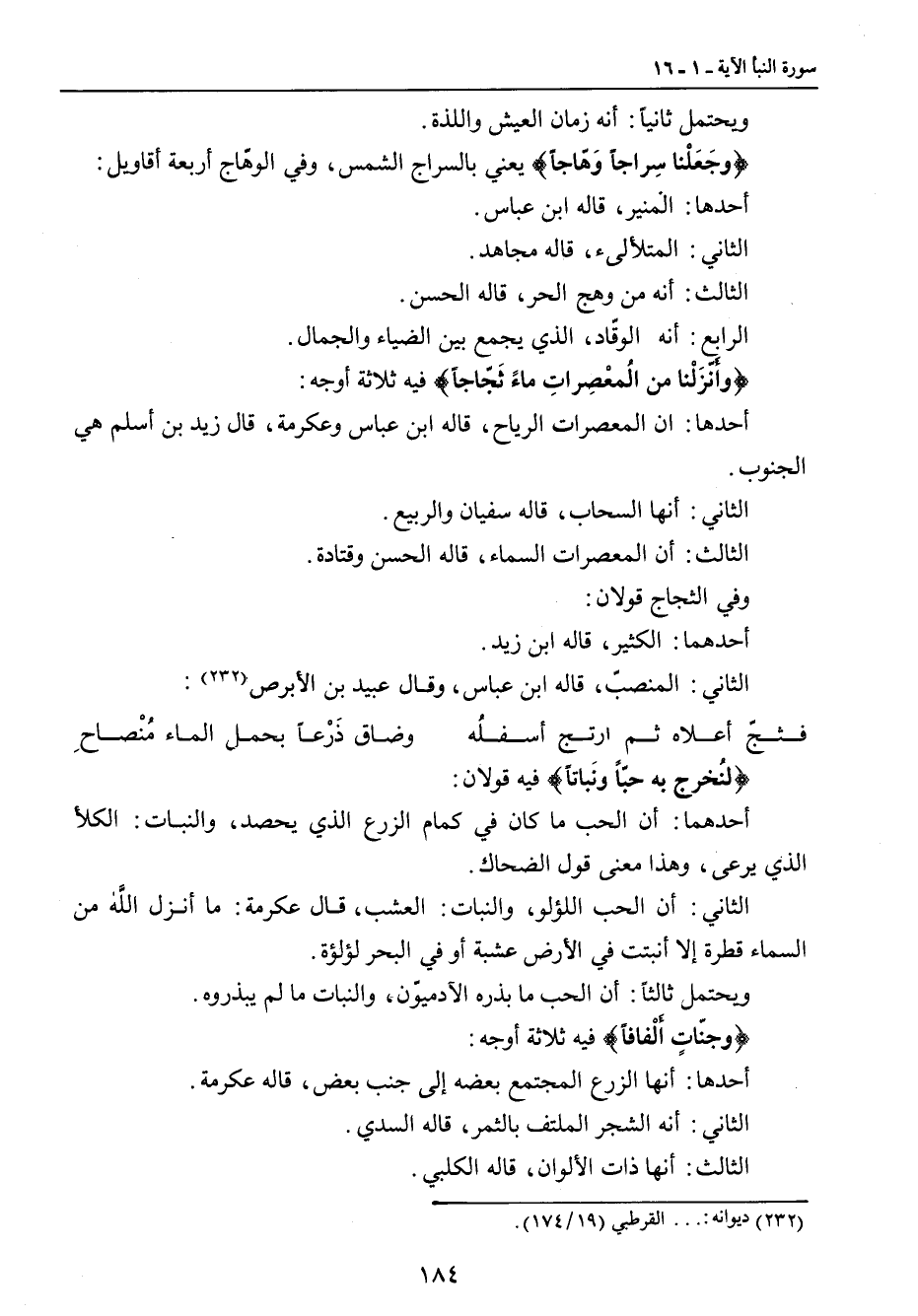 ويحتمل ثانياً: أنه زمان العيش واللذة. {وجَعَلْنا سِراجاً وَهّاجاً} يعني بالسراج الشمس، وفي الوهّاج أربعة أقاويل: أحدها: المنير، قاله ابن عباس. الثاني: المتلألىء، قاله مجاهد. الثالث: أنه من وهج الحر، قاله الحسن. الرابع: أنه الوقّاد، الذي يجمع بين الضياء والجمال. {وأَنْزَلْنا من المُعْصِراتِ ماءً ثَجّاجاً} فيه ثلاثة أوجه: أحدها: ان المعصرات الرياح , قاله ابن عباس وعكرمة , قال زيد بن أسلم هي الجنوب. الثاني: أنها السحاب , قاله سفيان والربيع. الثالث: أن المعصرات السماء , قاله الحسن وقتادة. وفي الثجاج قولان: أحدهما: الكثير قاله ابن زيد. الثاني: المنصبّ , قاله ابن عباس , وقال عبيد بن الأبرص: