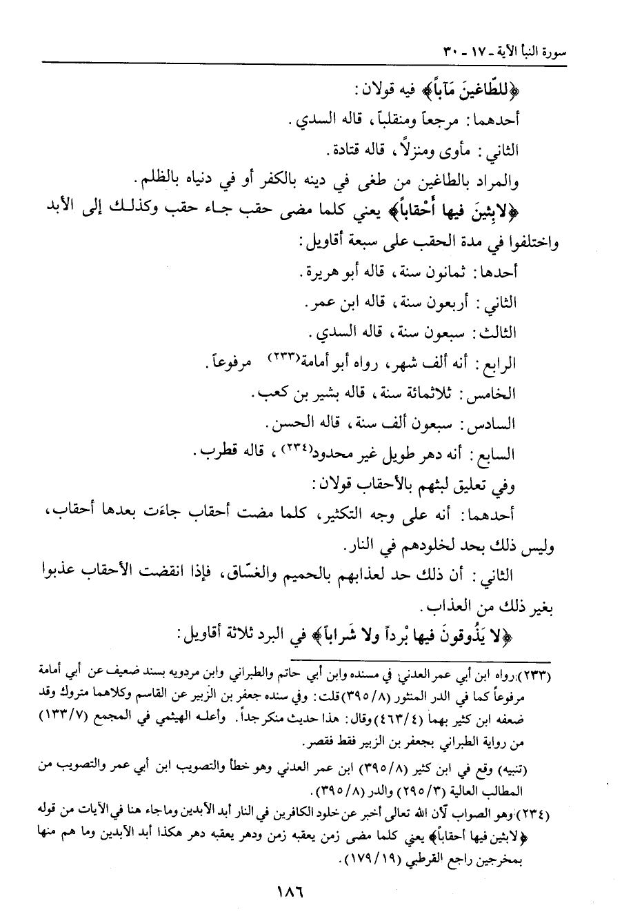 {للطّاغينَ مَآباً} فيه قولان: أحدهما: مرجعاً ومنقلباً , قاله السدي. الثاني: مأولى ومنزلاً , قاله قتادة. والمراد بالطاغين من طغى في دينه بالكفر أو في دنياه بالظلم. {لابِثينَ فيها أَحْقاباً} يعني كلما مضى حقب جاء حقب وكذلك إلى الأبد واختلفوا في مدة الحقب على سبعة أقاويل: أحدها: ثمانون سنة , قاله أبو هريرة. الثاني: أربعون سنة , قاله ابن عمر. الثالث: سبعون سنة , قاله السدي. الرابع: أنه ألف شهر , رواه أبو أمامة مرفوعاً. الخامس: ثلاثمائة سنة , قاله بشير بن كعب. السادس: سبعون ألف سنة , قاله الحسن. السابع: أنه دهر طويل غير محدود , قاله قطرب. وفي تعليق لبثهم بالأحقاب قولان: أحدهما: أنه على وجه التكثير , كلما مضت أحقاب جاءَت بعدها أحقاب , وليس ذلك بحد لخلودهم في النار. الثاني: أن ذلك حد لعذابهم بالحميم والغسّاق , فإذا انقضت الأحقاب عذبوا بغير ذلك من العذاب. {لا يَذُوقونَ فيها بَرداً ولا شَراباً} في البرد ثلاثة أقاويل:
